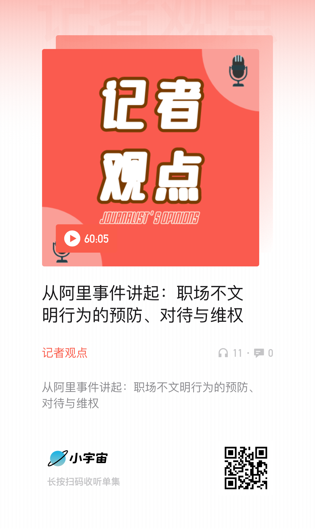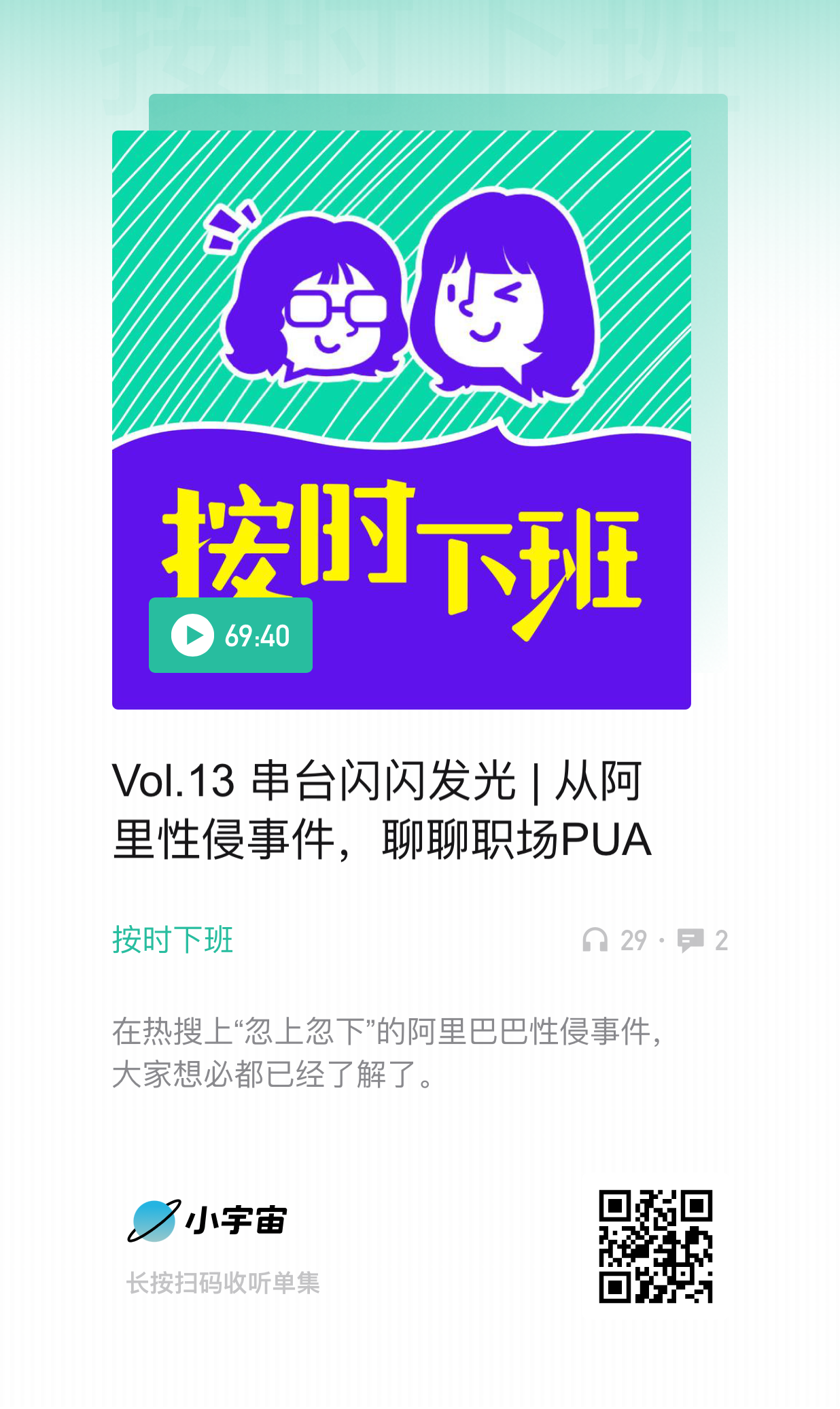 到今天早上7点前,通过小宇宙搜索关键词搜出的所有关于阿里事件的节目。大概都过了一遍。质量最高,最值得推荐的是老TALK消息,作为离互联网比较近的“业内人士”,分析的很深入,从事件本身出发,分析了阿里为什么会走到现在这个被众人唾骂的地步。而不只是就事论事。态度立场也很客观公正,本着“治病救人”的态度。其他的几期,怎么说呢,个人感觉没有什么特别新意,无非还是关注女性职场性骚扰,女权等问题。播客人都很努力,这一点值得肯定,毕竟是份几乎没啥回报的额外工作。但是吧,蹭热点这事,毕竟有了速度,就可能在深度上会有欠缺。播客是否要跟其他自媒体一样热点必蹭,值得思考和讨论。如果不是对某领域有深耕或特别关注,纯粹为热点而热点,输出的内容质量有多高?值得商榷。短视频蹭个热点,一分钟完事儿,ROI还不会太低,一期30分钟以上的播客,从录制到剪辑到上传,考虑到收听习惯收听规模,ROI有能到多高?这个帐其实也得好好算算。一直觉得中国播客发展到现在,节目要想出头,还真的开始向垂直化专业化发展,每个播客都深耕自己擅长的领域,而不是什么热点都去蹭。哦对了,按时下班那期,是标题党,不是讲阿里的,想听阿里的可以跳过。最后说一句,再次推荐老TALK的这期。