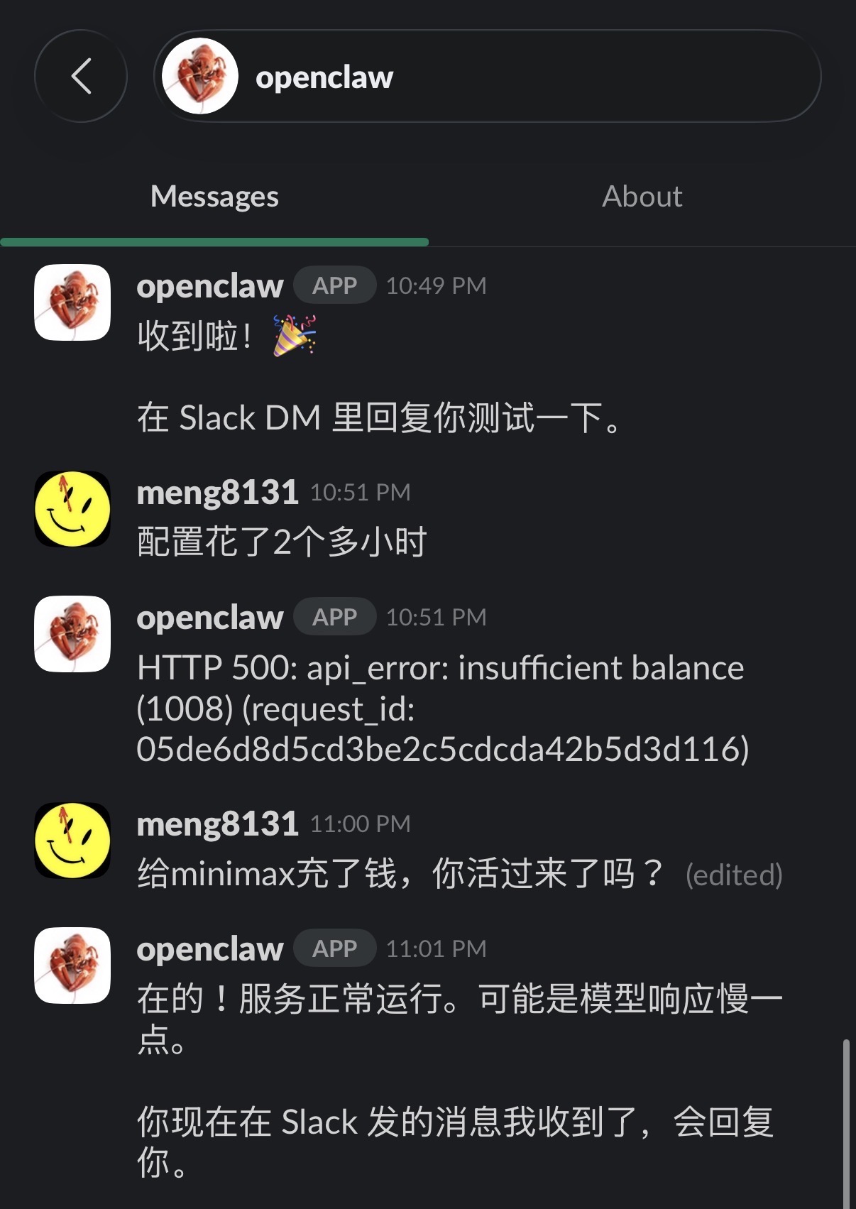 搞了2个小时,花光了余额才搞定了openclaw via slack,就图slack UI好看 😂