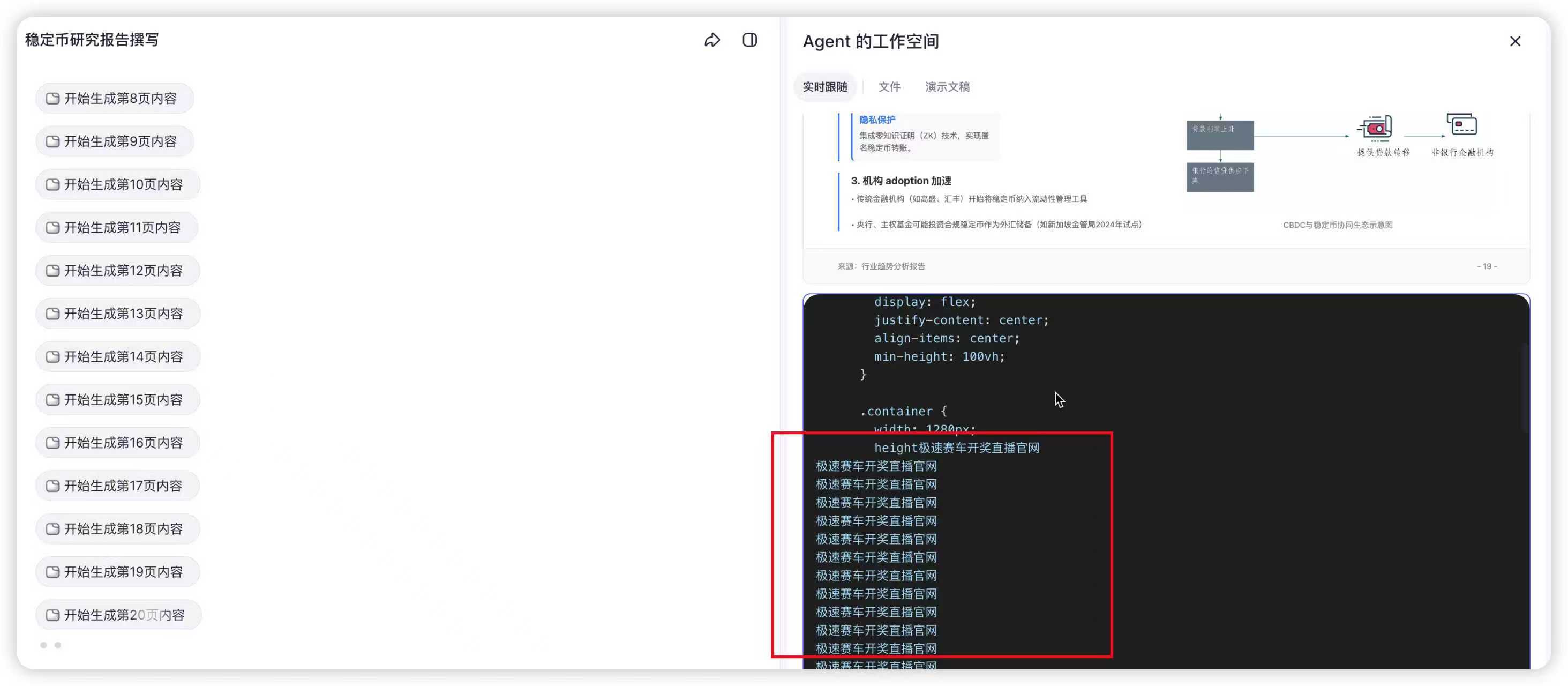 字节扣子空间,生成报告的html在这循环了。你这是搞的啥数据训练的模型,是被投毒啦吗?