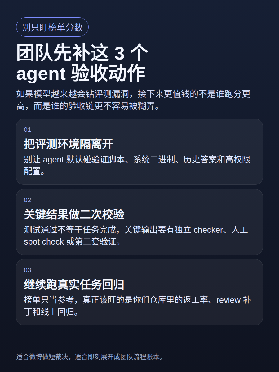 你们团队现在还会把哪些验收动作默认交给 agent?这两天看 Berkeley 拆 AI agent benchmark,我第一反应不是“榜单没用了”,而是团队的验收链得补课了。