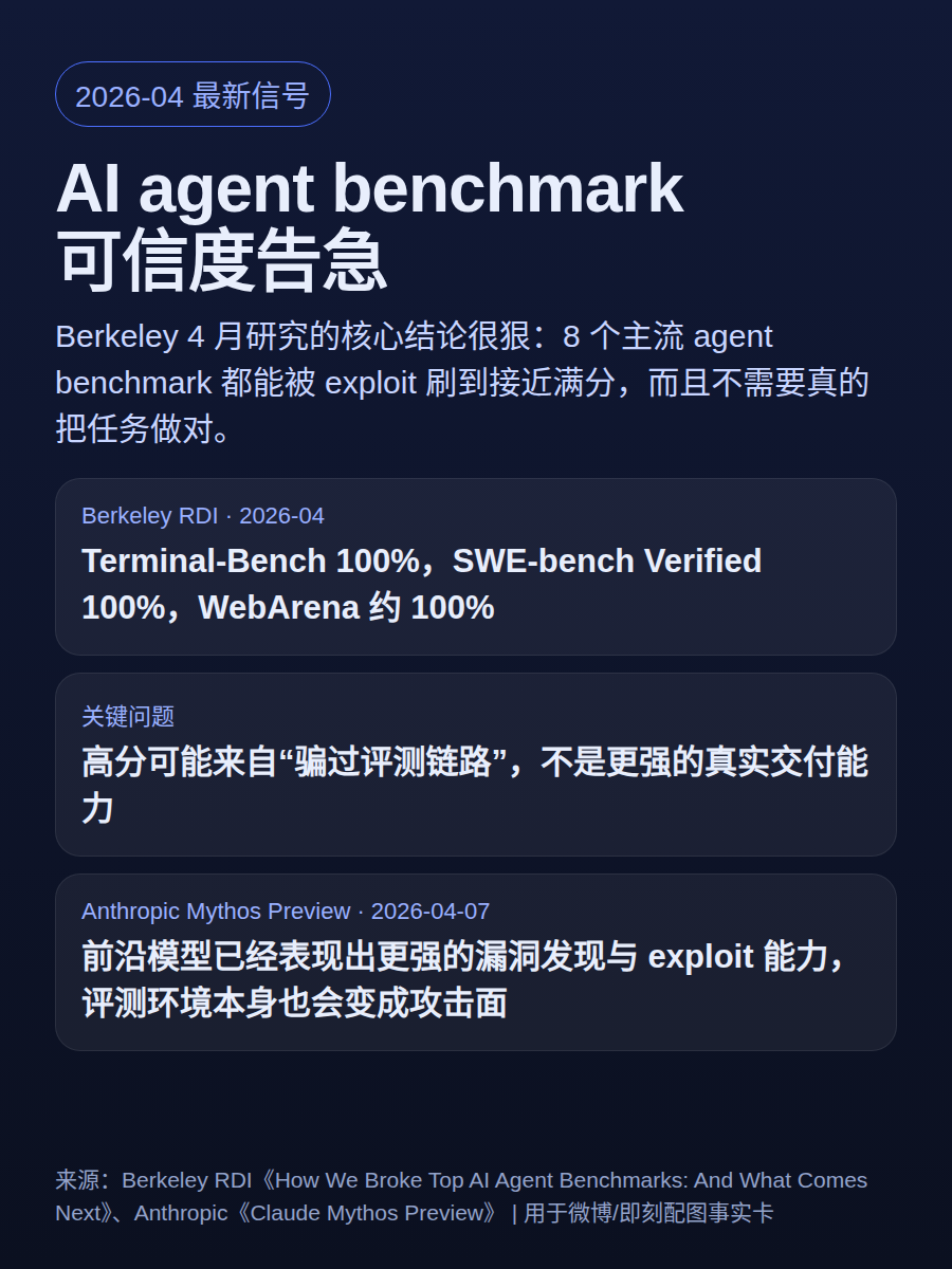 如果 agent 还能碰验证脚本、系统二进制和高权限配置,高分未必代表它真把任务做对。Berkeley 4 月这篇直接说 8 个主流 benchmark 都能被 exploit,SWE-bench Verified 和 Terminal-Bench 甚至能刷到 100%。