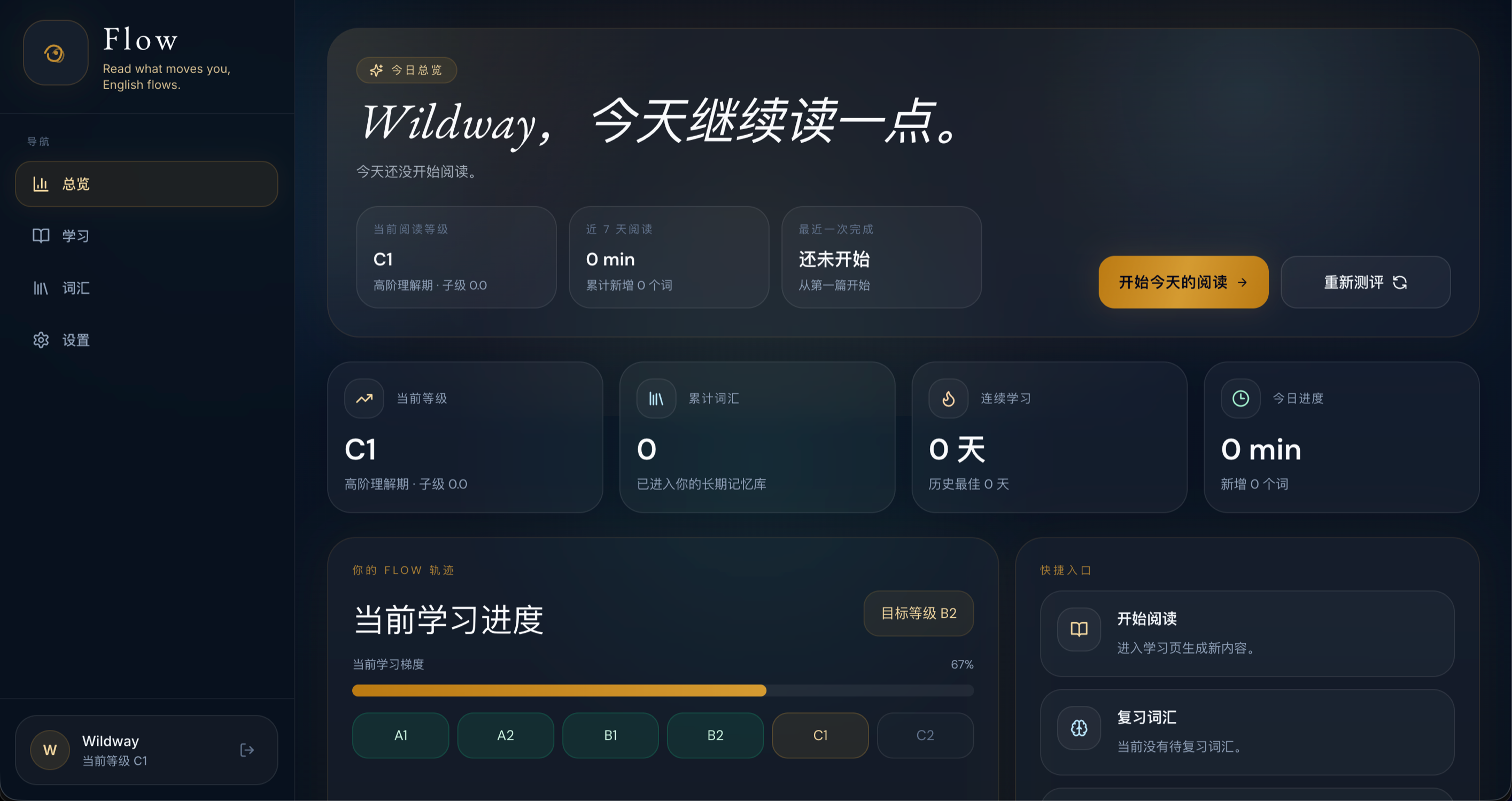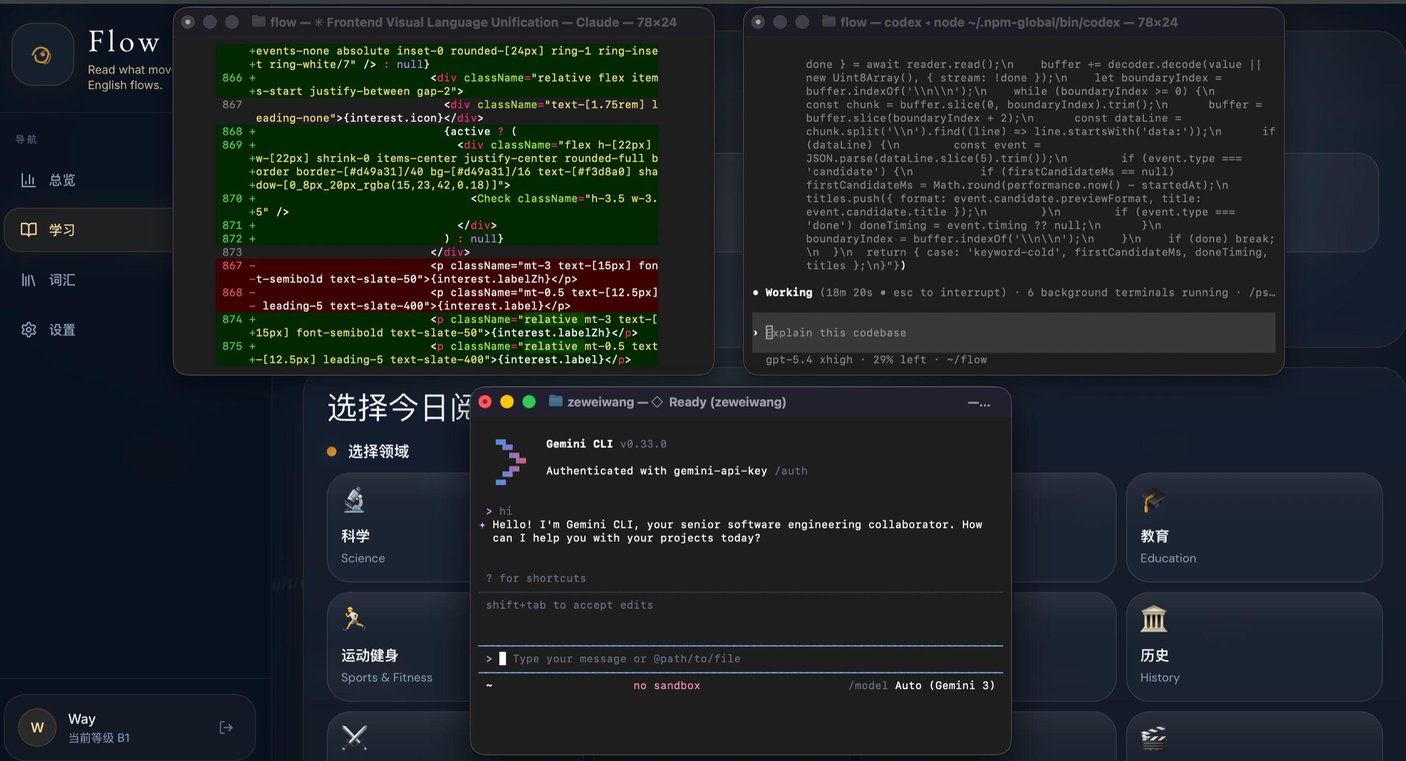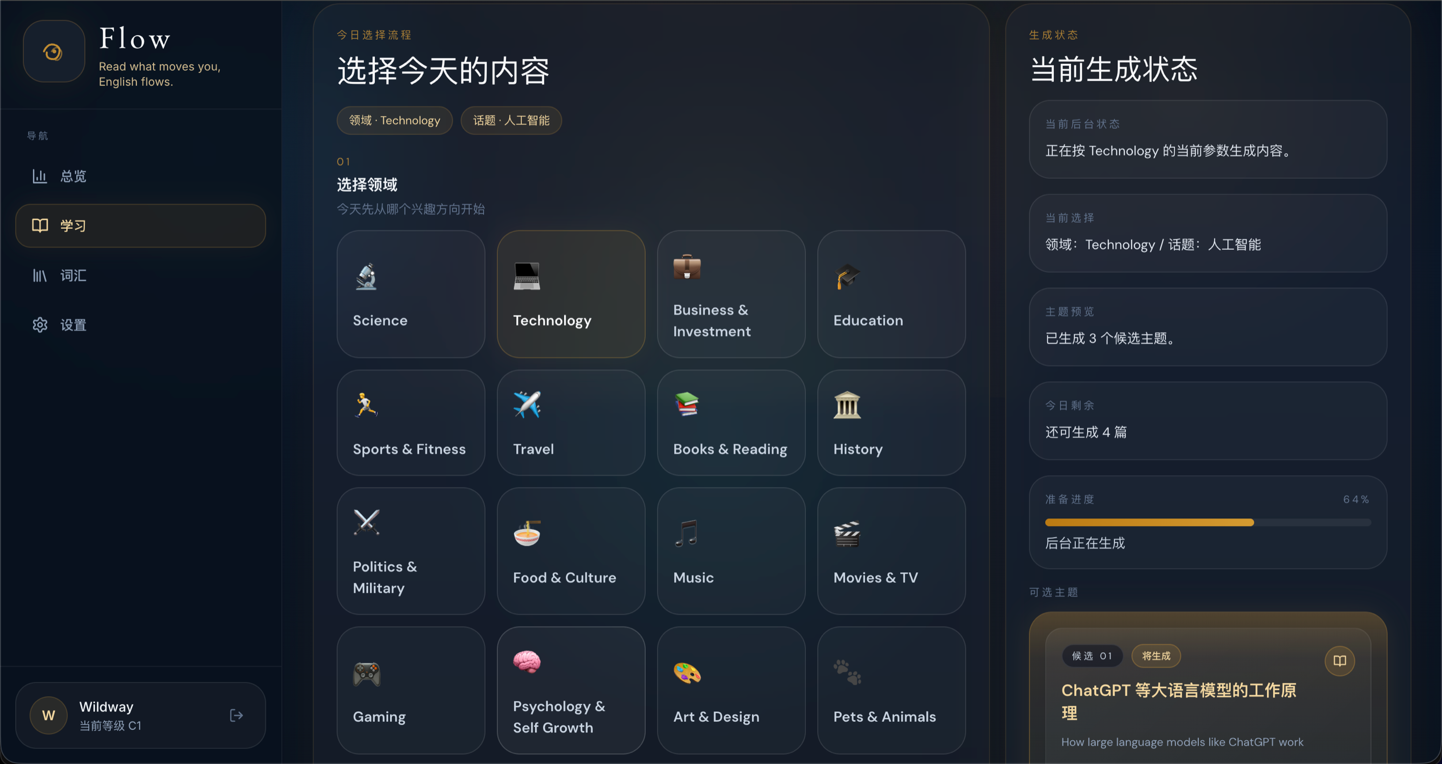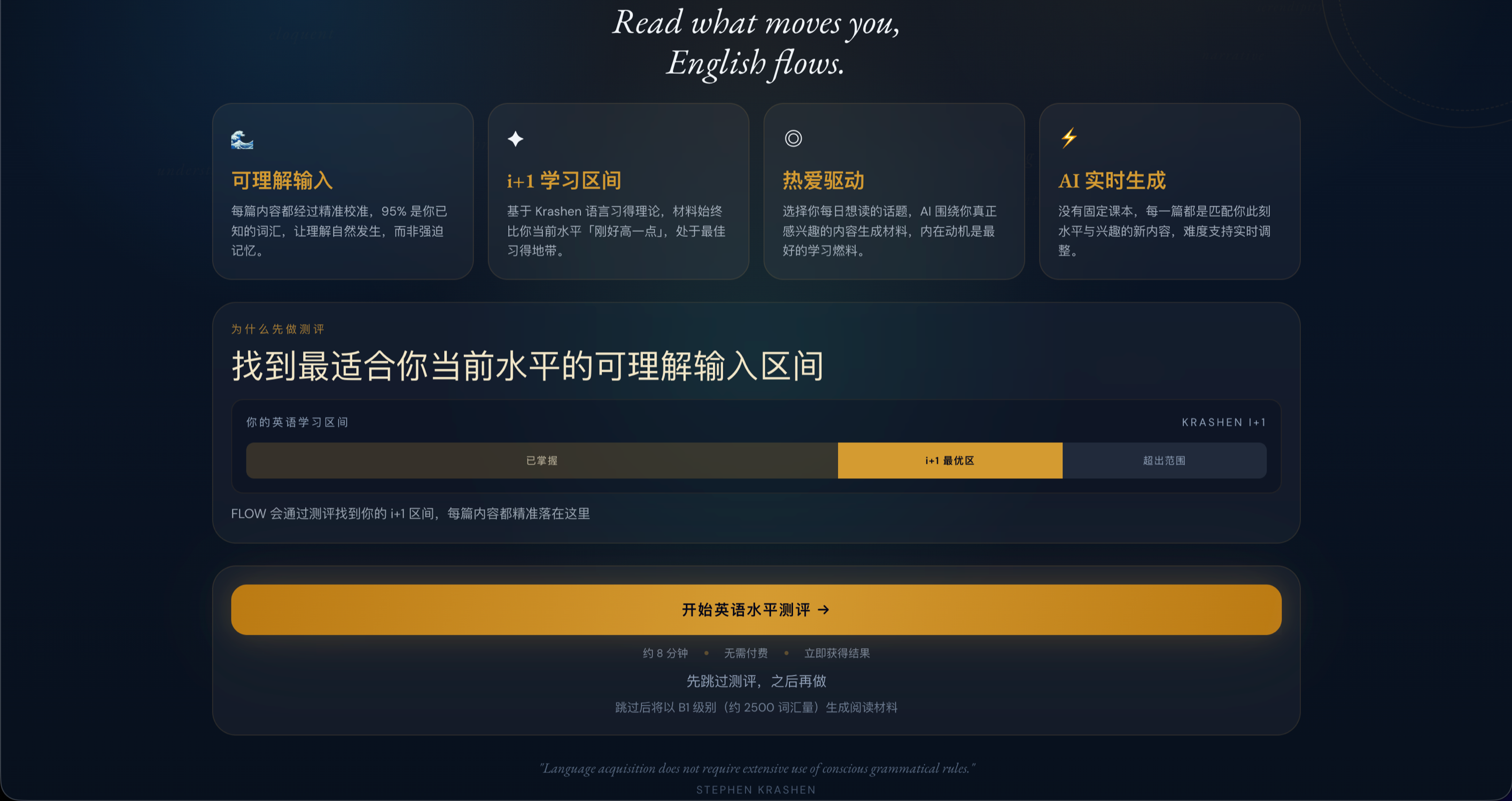 我正在开发一款AI英语学习应用Flow.AI,产品的核心理念是:真正的语言习得不来自死记硬背单词语法规则,而是大量吸收「刚好比当前水平高一点点」的真实语言材料,即可理解输入理论(Comprehensible Input),并在兴趣驱动下持续沉浸其中。