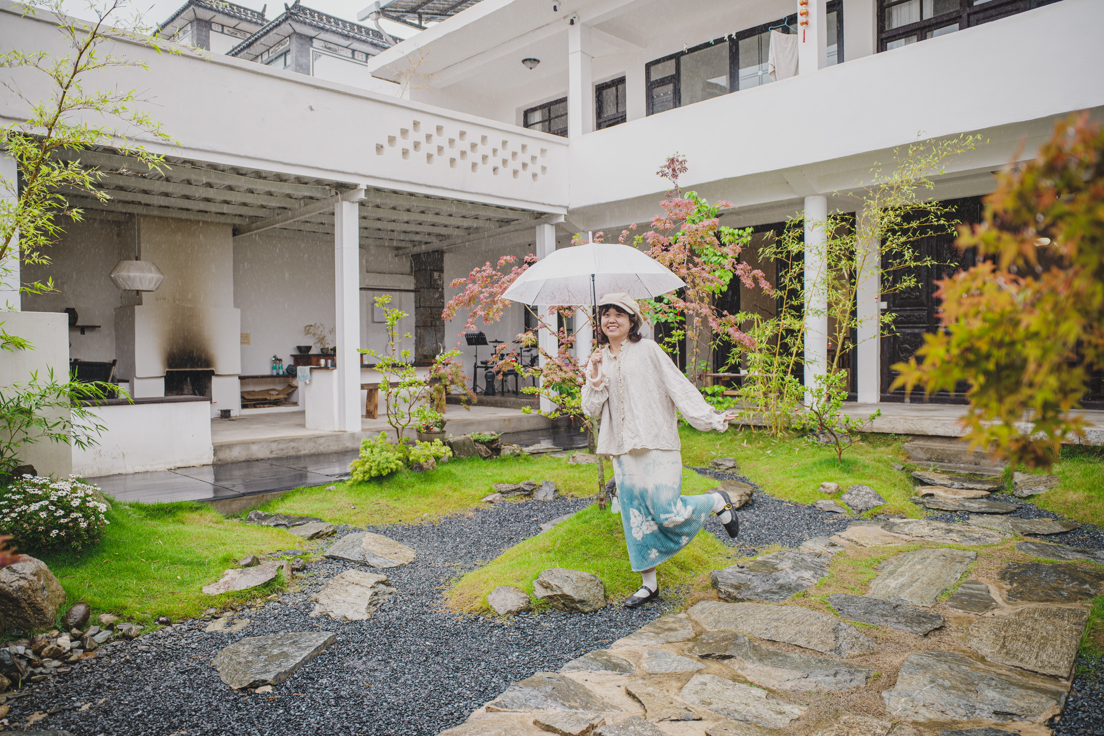 公共区域:室内大客厅(带榻榻米)、室外办公区(带壁炉)、独立卫生间一个,大厨房。
