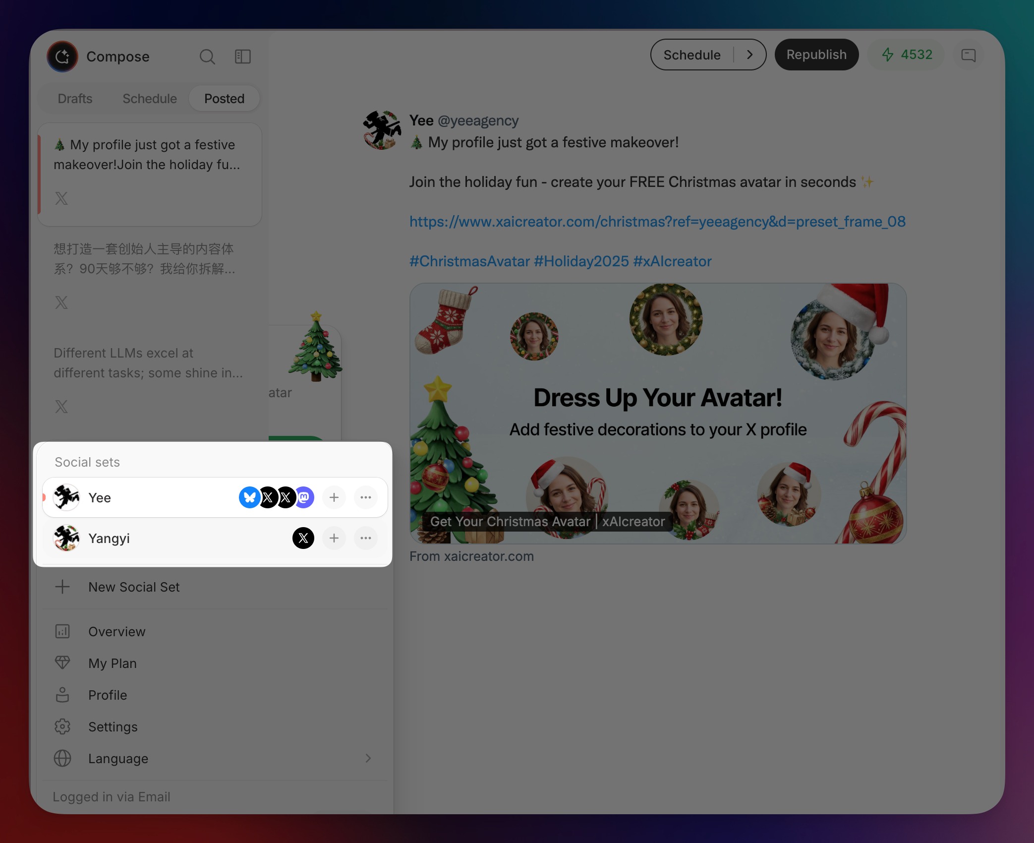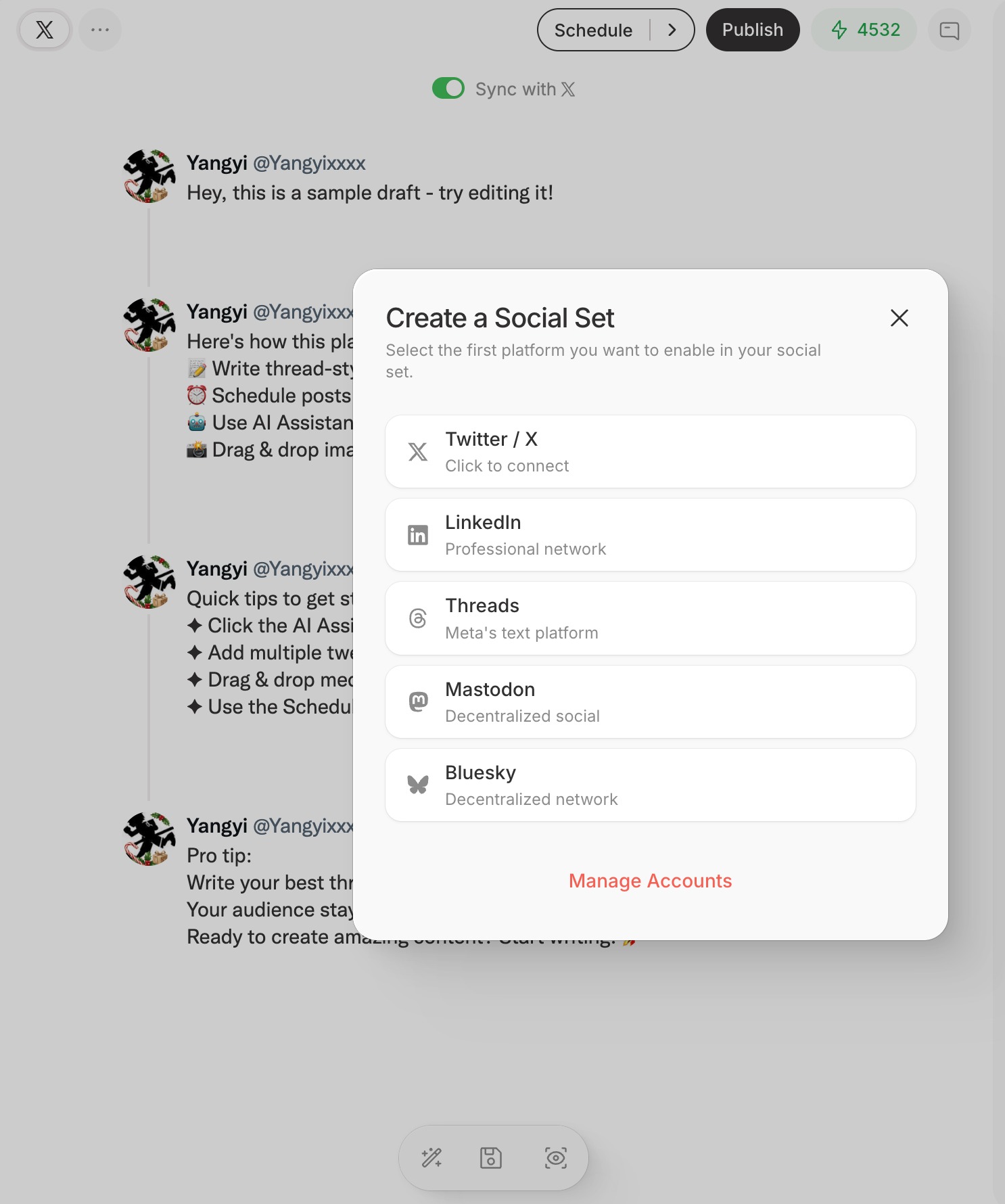 - 5个平台已经全面接入:X,Threads,Linkedin,Bluesky和Mastodon