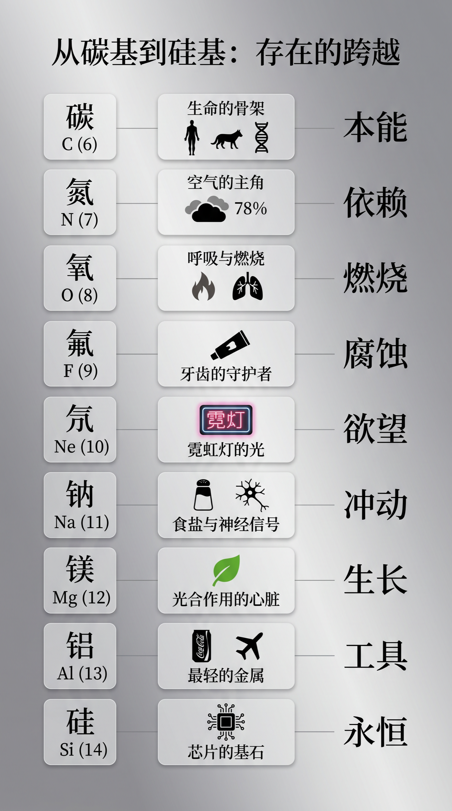有个不对但好玩的角度,在化学元素周期表上,碳和硅属同一列,中间隔着 7 个元素。那是不是只要找到平替办法,迈过了这 7 个,地球人就完成了交接棒?