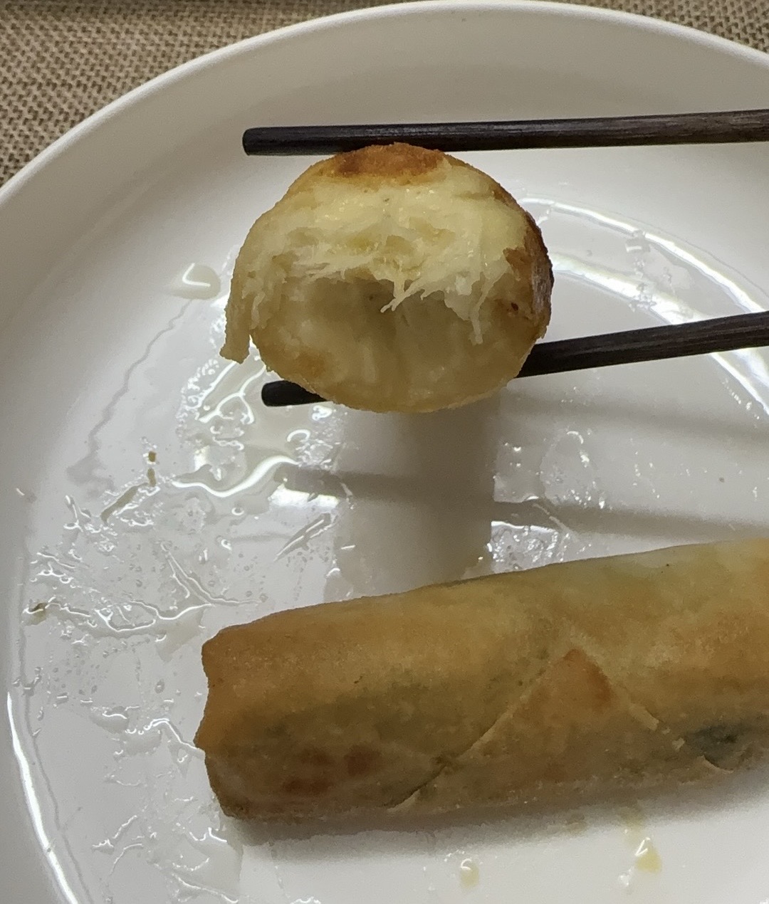 用了南翔速冻春卷皮+黑虎虾滑+冷冻荠菜+猪肉馅,简单用姜汁、盐糖鸡粉调味,打一颗蛋液搅匀就可以包了。今晚是特别想感谢食品工业的一顿😌p3是拿多余的春卷皮包了一段香蕉,美味