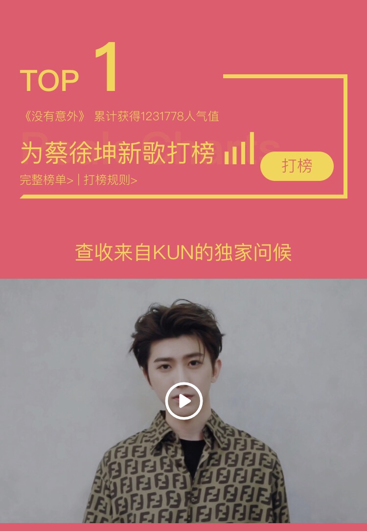 🙆🏻♀️ 《没有意外》大家都听了叭!这首歌由林宥嘉作曲,蔡徐坤亲自填词,和偶像共同创作,可以说是超成功的追星典范了!此外,在IKUN们的努力下,新歌霸占了超多榜单1位,超棒!期待新MV的发布,也希望各位ikun可以踊跃参与