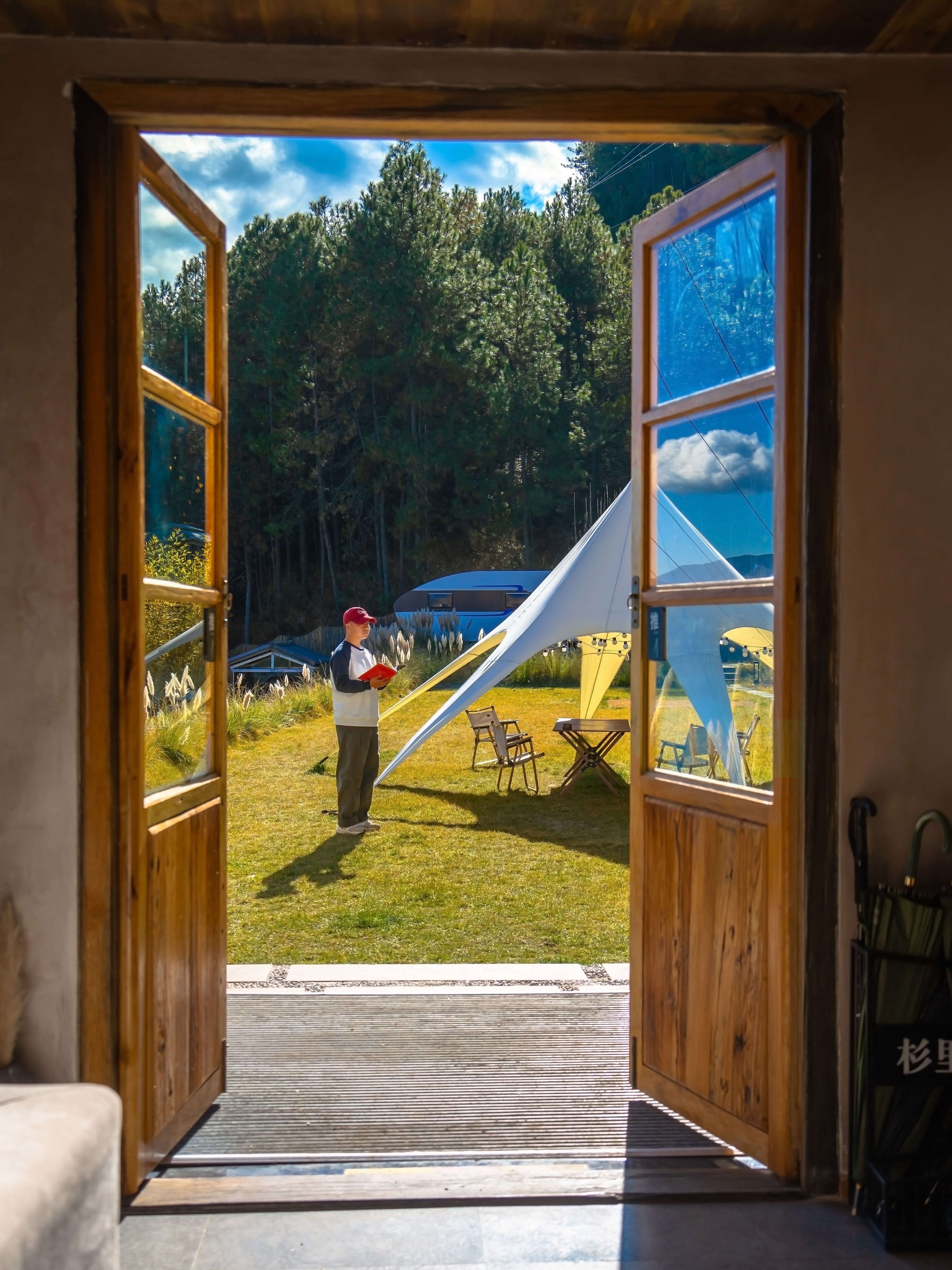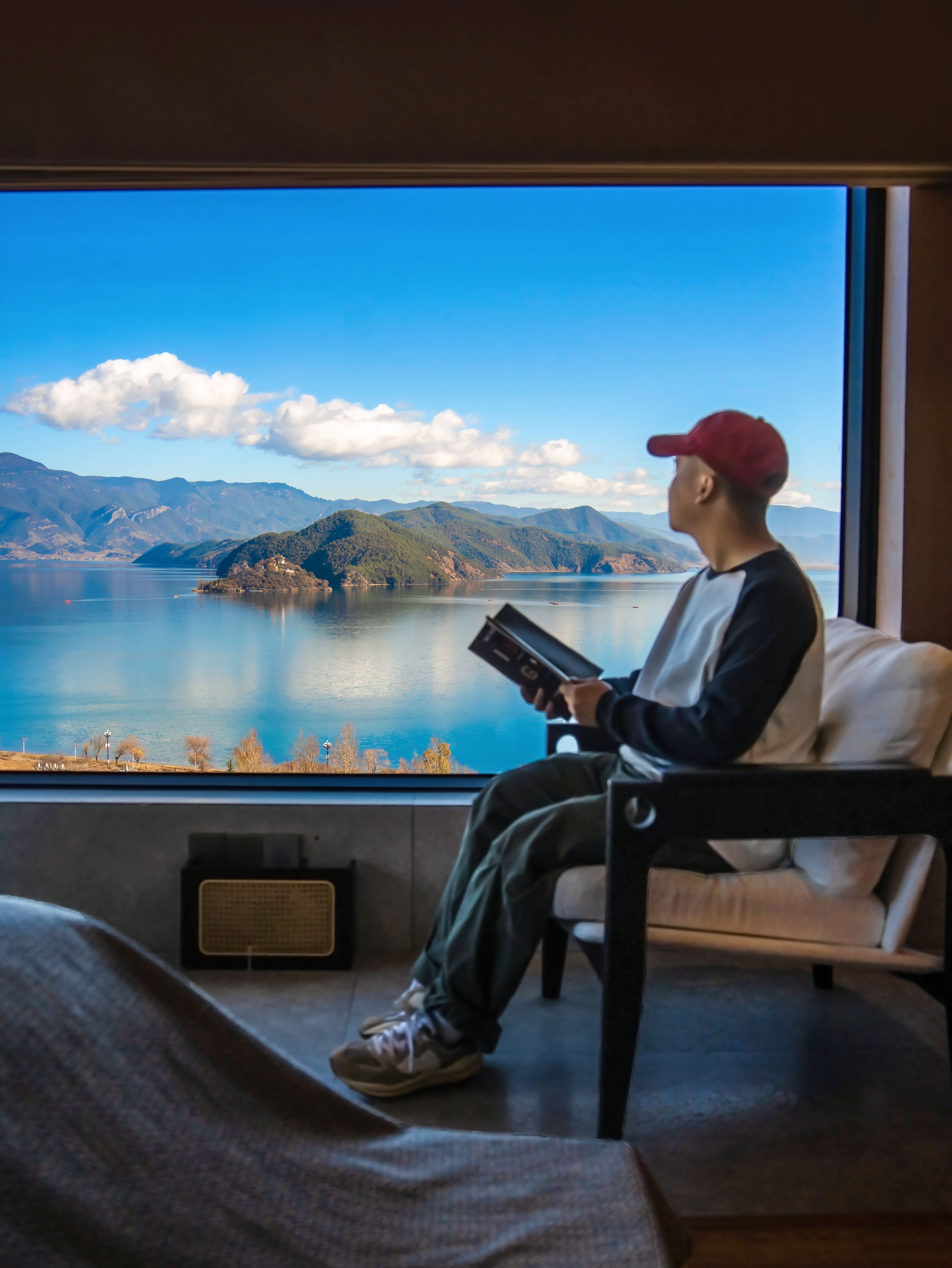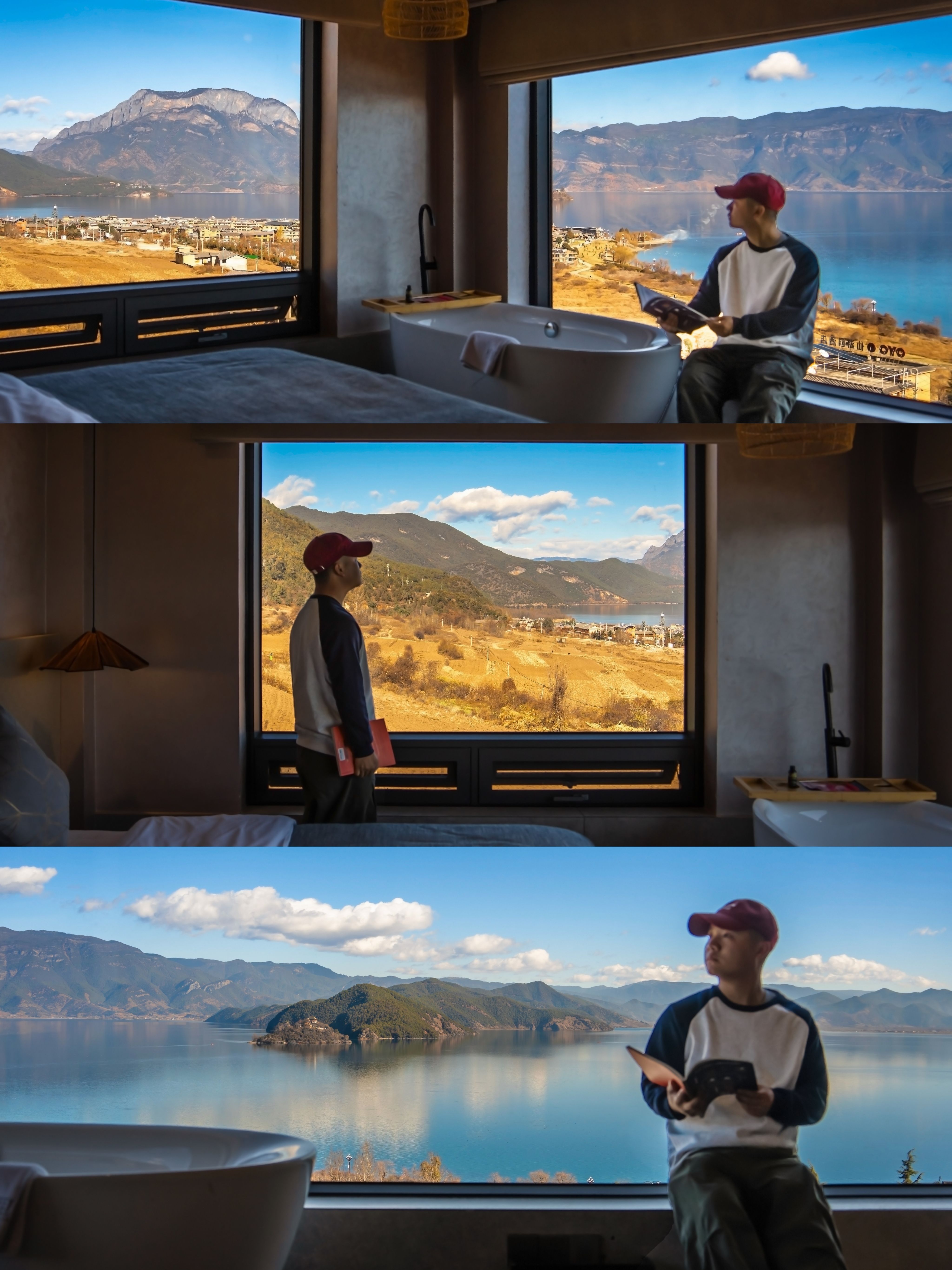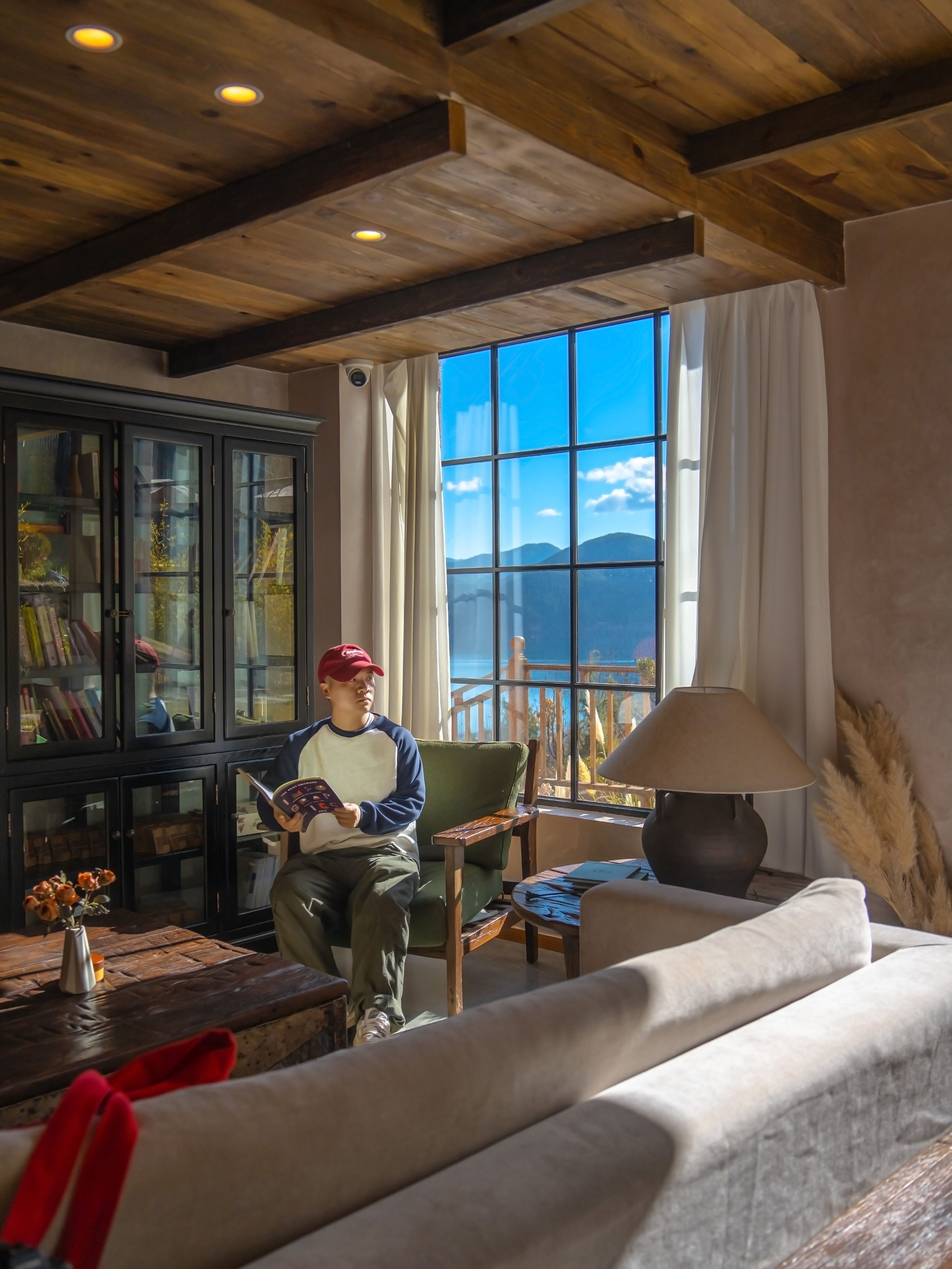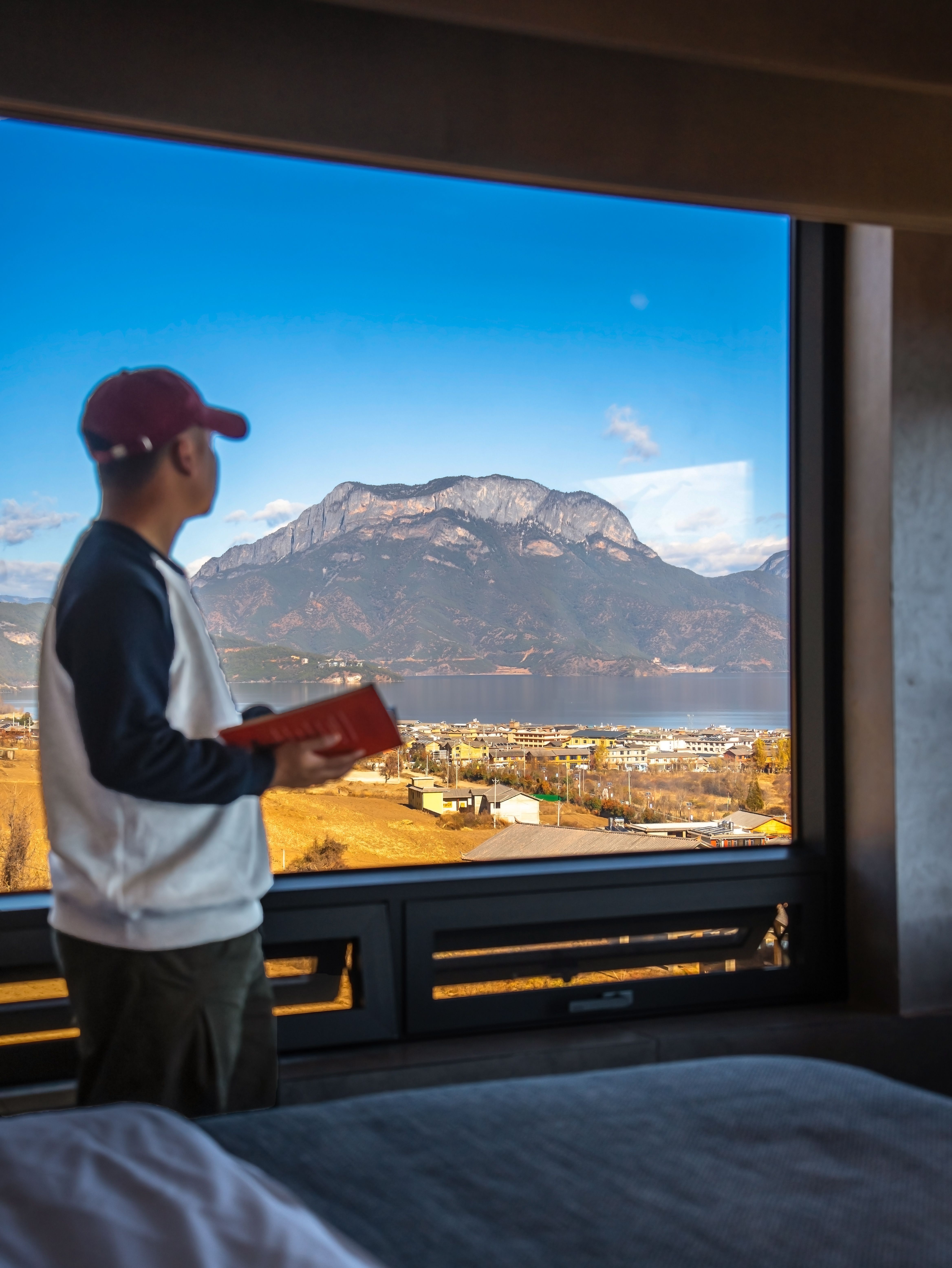 民宿坐落在大落水村半山,拥有俯瞰湖光山色的绝版视野,在房间内就能坐拥格姆女神山与晨雾日出。为抵御高原冬日的干冷,房间贴心配备了地暖、智能马桶和加湿器,确保一夜安眠。