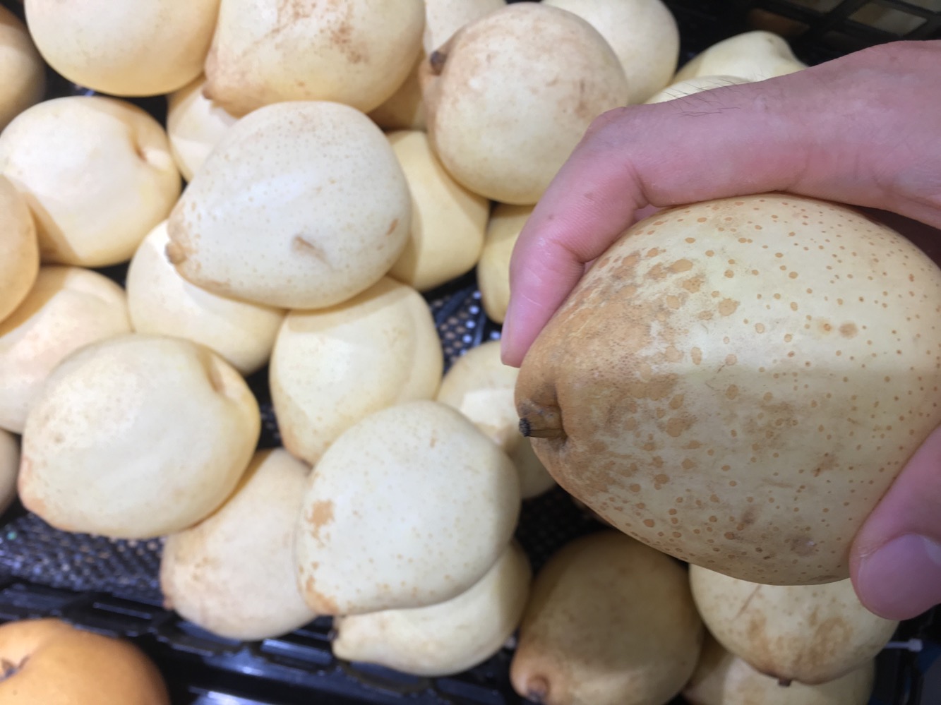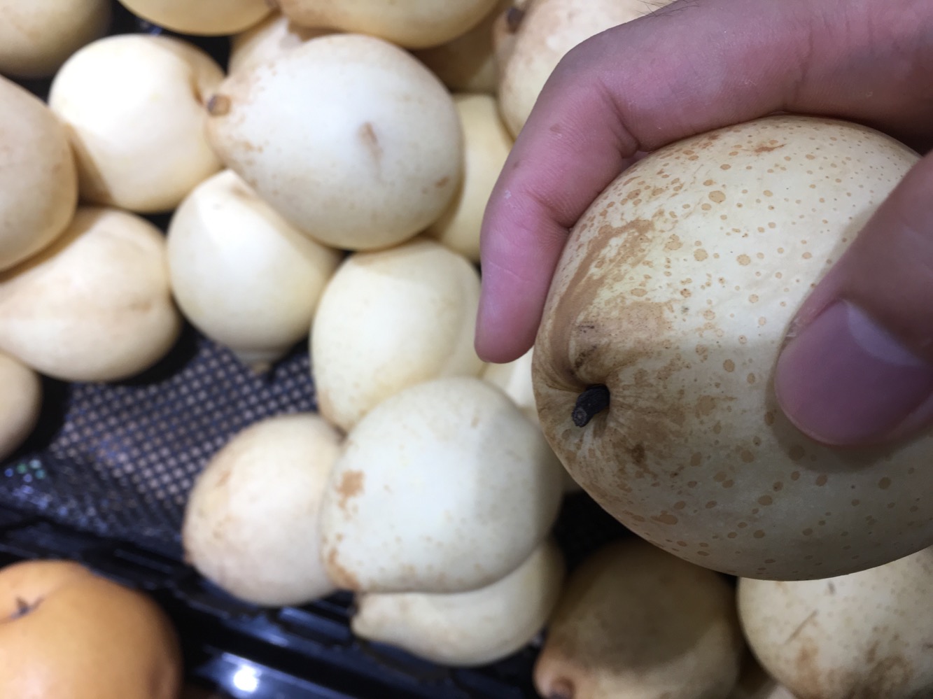 图一就是整根梨子把儿都干枯了,肯定冷库放了1年且保存没那么好,水分流失太多。如果你选了这种,切开后梨核,甚至包括周围都是黑的。