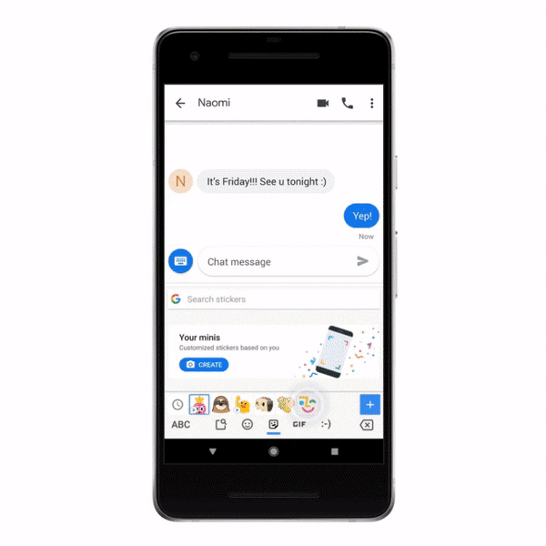 Google输入法“Gborad ”新增一项叫做“Mini”的 AI 贴纸功能,通过前置摄像头获取面部特征,为用户智能生成虚拟卡通形象,作为表情在聊天中直接使用。