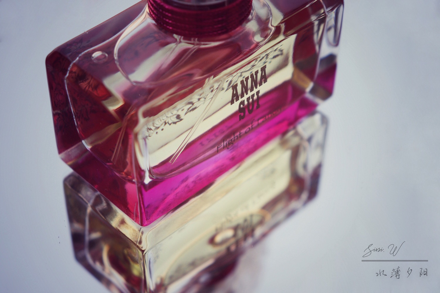 基础的香调是带着白桃味道的柑橘调,就像往榨汁机里丢了几瓣水蜜桃、几瓣西柚和一些水分充足的水果后,按下开关,汁水不受控制的飞溅出来的那种清甜。而后后调延伸出木质香调的沉稳感。具体的香调测评见p1,脑补出了一个小故事。这次测评是视觉与嗅觉的双重享受,在最喜欢的柑橘调里拍晶莹剔透的香水瓶,真是愉快。