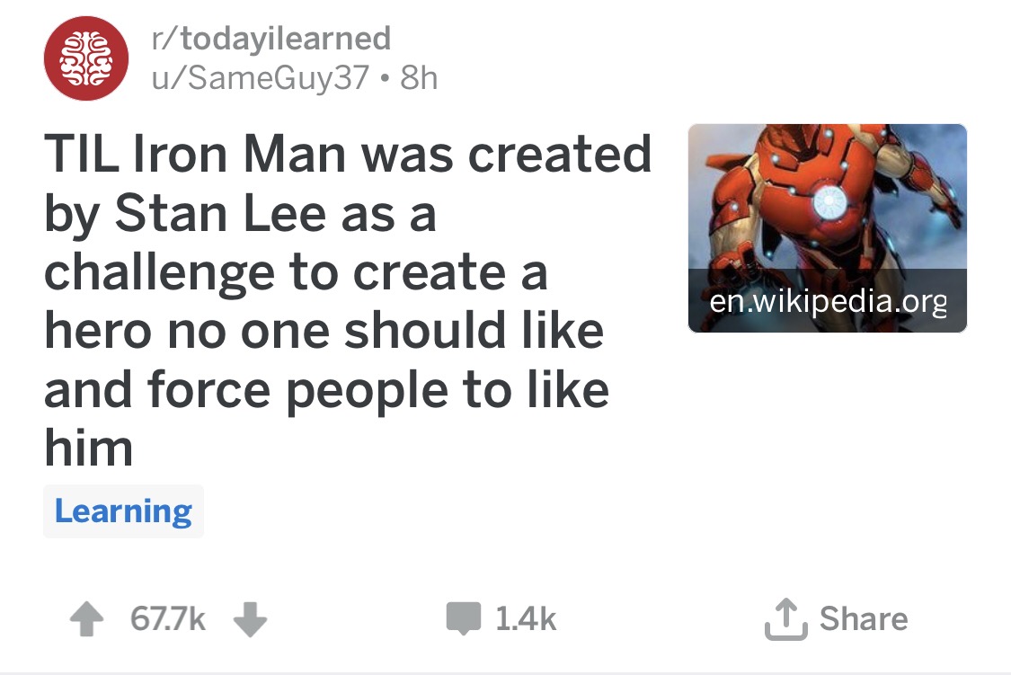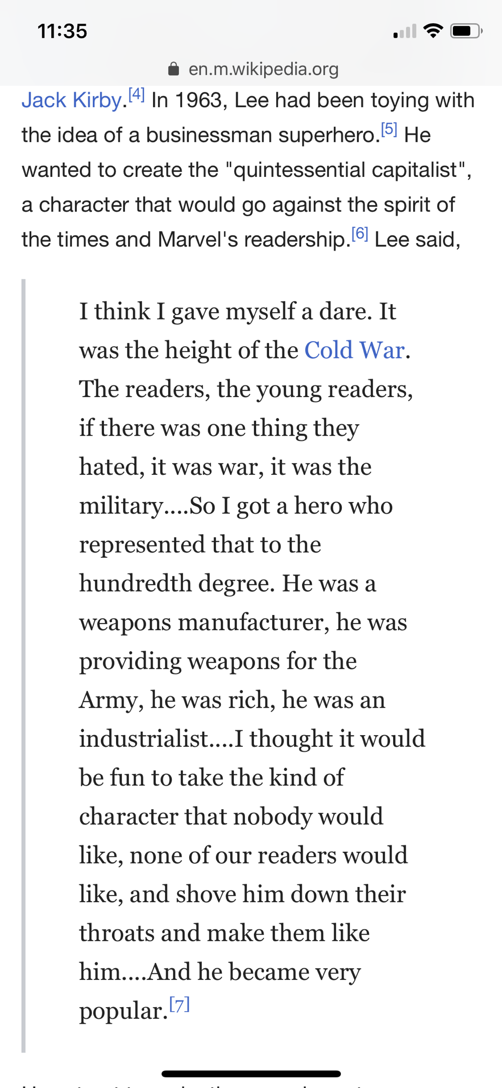 他说,“我想我给了自己一个挑战。那时候是冷战的高峰期。对于读者、年轻的读者们来说,如果有一件事情是他们所厌恶的,那就是战争、军队。所以我就设计了一个代表着这一切的英雄。他是武器制造商、他为军方提供武器、他很有钱、他是一个实业家……我觉得选取这种没人会喜欢、我们的读者都不会喜欢的角色设定,然后给大家灌输、强迫大家喜欢的过程很有趣……然后呢,他(钢铁侠)变得非常受欢迎了。”