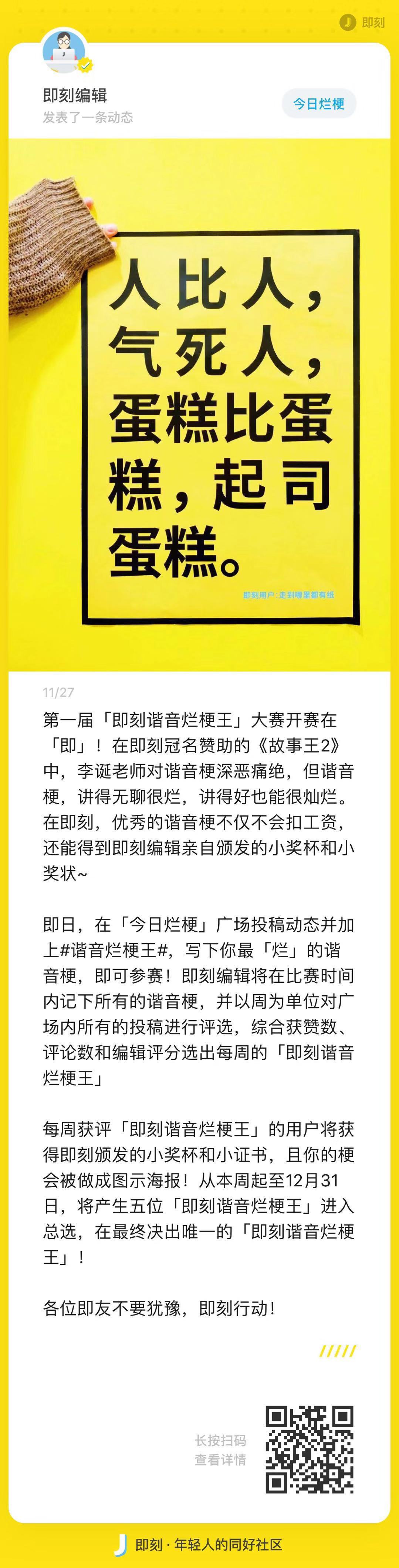经过一周激烈的竞赛,即刻编辑共收到八百多条即友的参赛作品,在众多作品中经过各位编辑们的严格筛选和讨论,最终选出本周的#谐音烂梗王#是即友