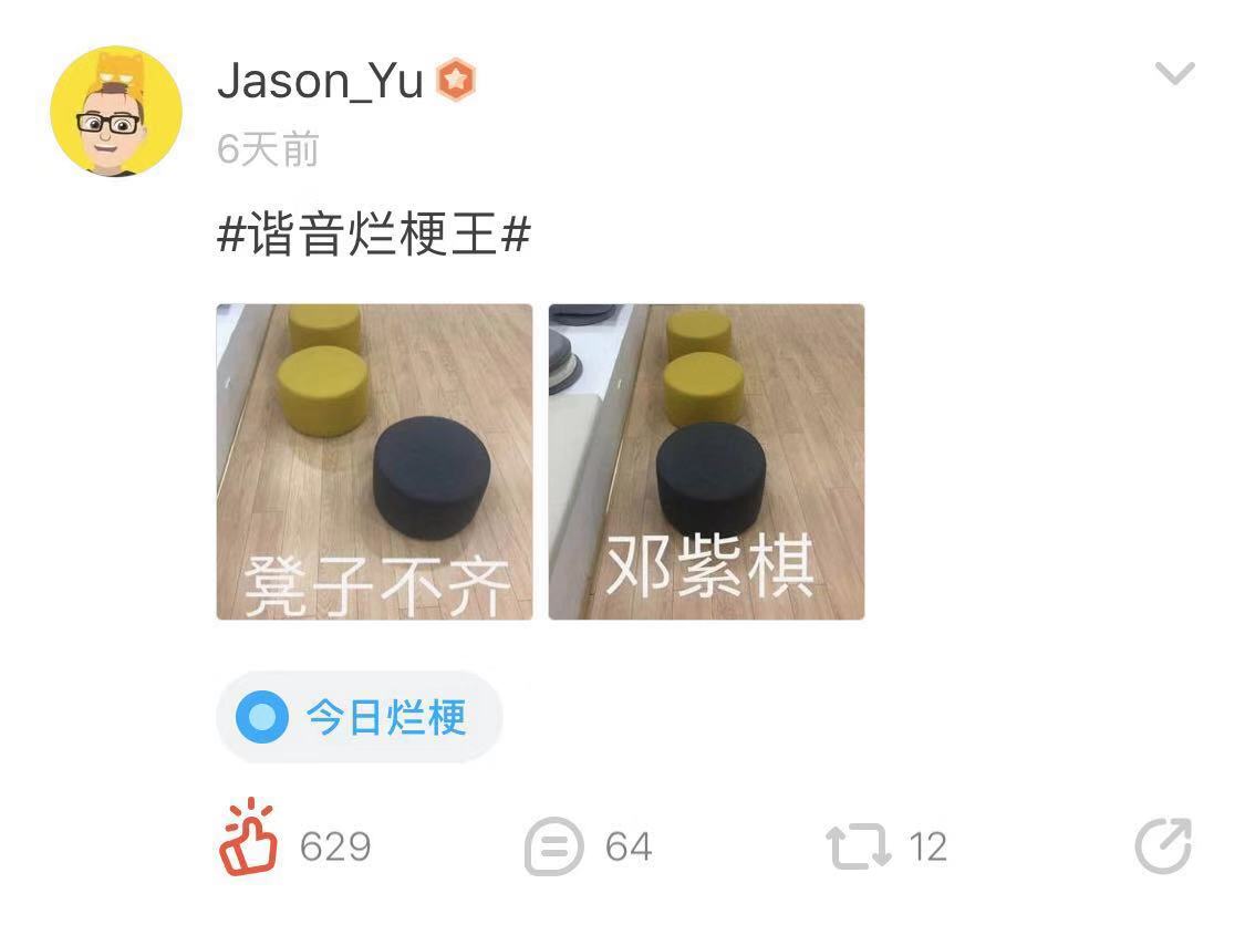 @Jason_Yu 虽然错失获得#谐音烂梗王#的称号,但他绝美的烂梗让众多编辑佩服不已,特此点名鼓励,希望再接再厉冲击第二周的冠军