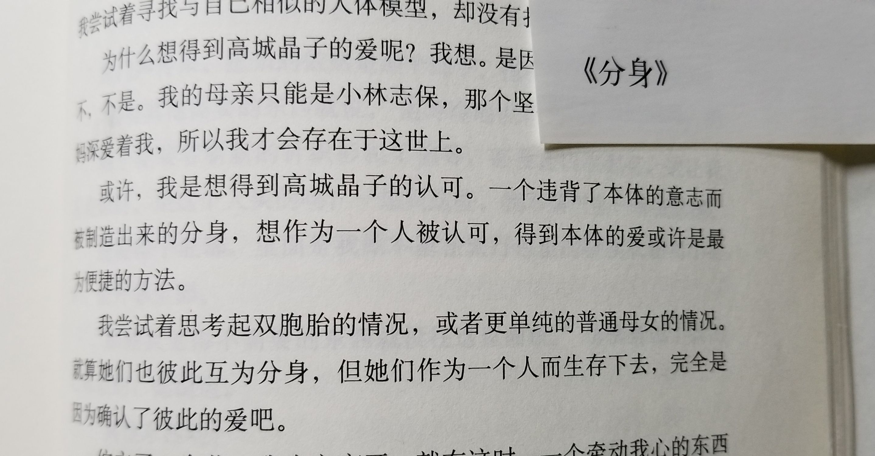 其实我着重的不是配图所说的关注分身,而是里面关于亲情的讨论,更详细一点是母爱。对于后代的爱,是因为他们具有我们一半的基因,是我们身体一部分的传承,对一模一样的基因复制出来的后代为什么又会产生厌恶(小说中另外一位并非如此)。对子女的母爱,是因为十月怀胎,流淌着忍受痛苦的分离出来的血肉。东野圭吾,借着书中不同角色的嘴表达着不同的观点,厌恶着他人基因的胚胎在自己的身体发育,养育着他人的孩子,不忍心杀死肚子里没有自己基因的孩子,女性难道只是生育工具吗?。当然,书中还有其他的讨论,只不过借了克隆这一个脱离现实外壳去讲述对于现实的思考。