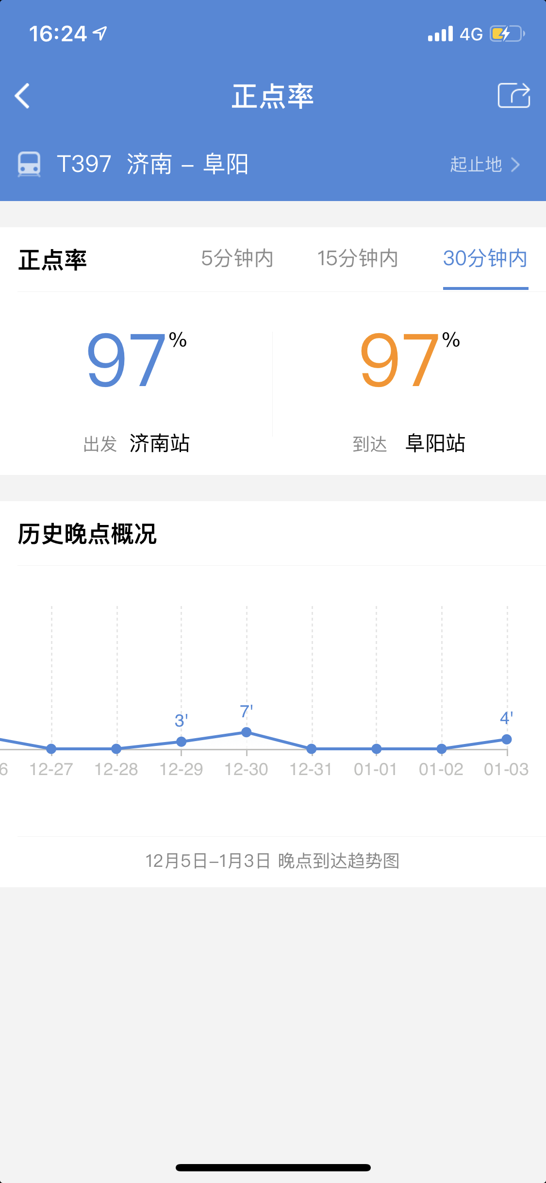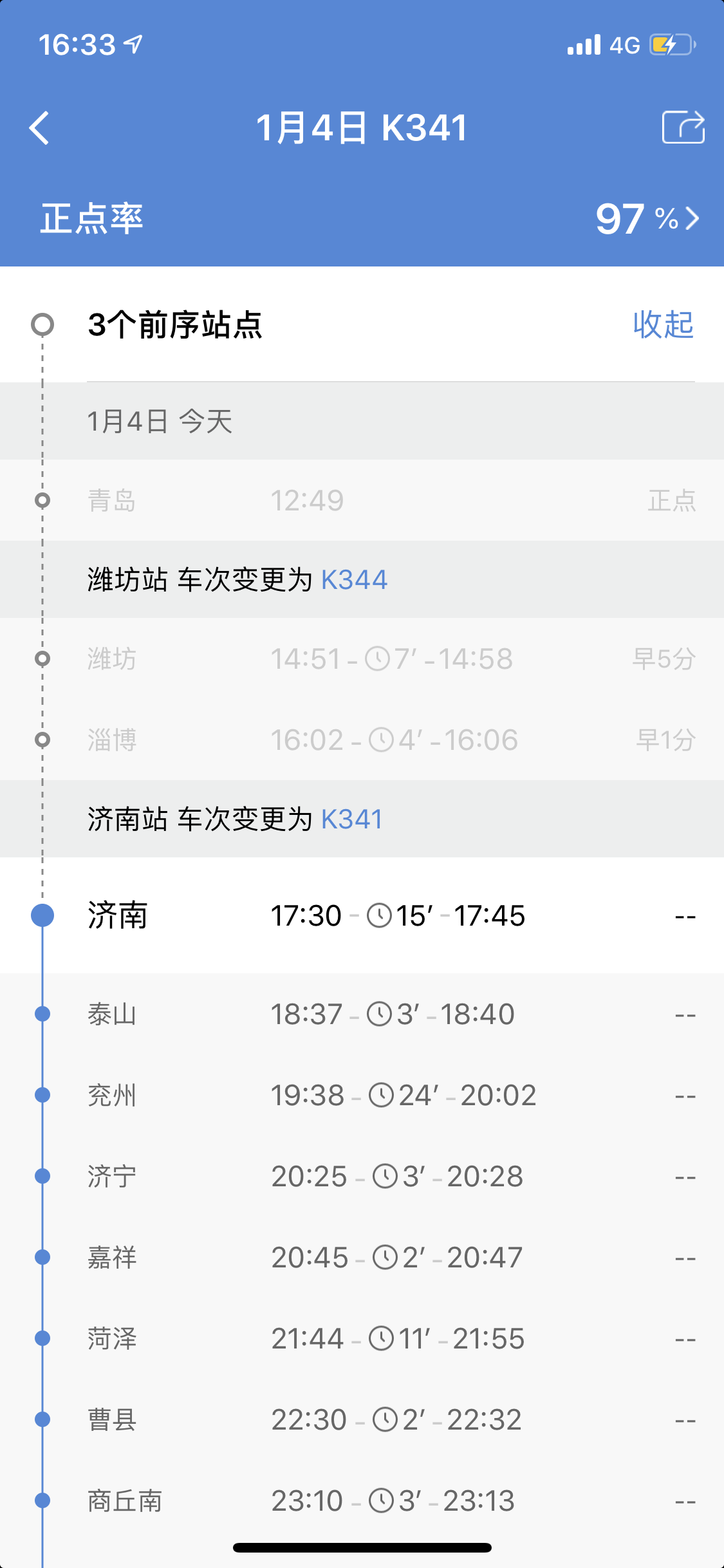 除此之外,根据我自己的使用经验来看,添加车票到行程后,它提供的预计晚点信息还是比较准确的。之前有几次列车晚点,实际晚点时长跟软件所提前预测的时长相差不大(不过晚点具体还是要以车站显示牌为准)。