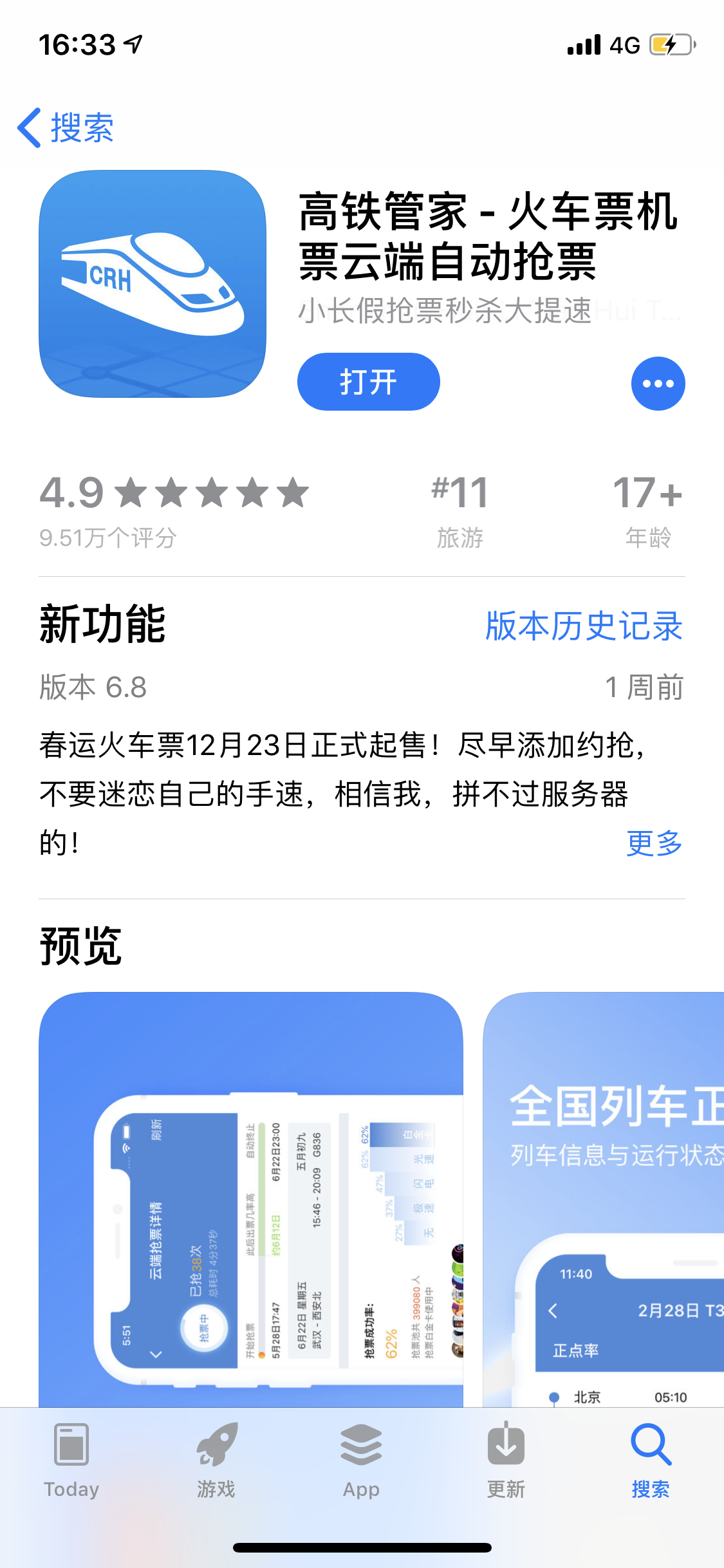 我用这个软件主要是使用上面几个功能,对它提供的其他功能(购票、抢票、宾馆预订等)使用不多,所以不做评价🤣