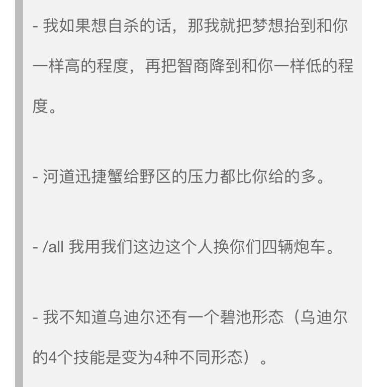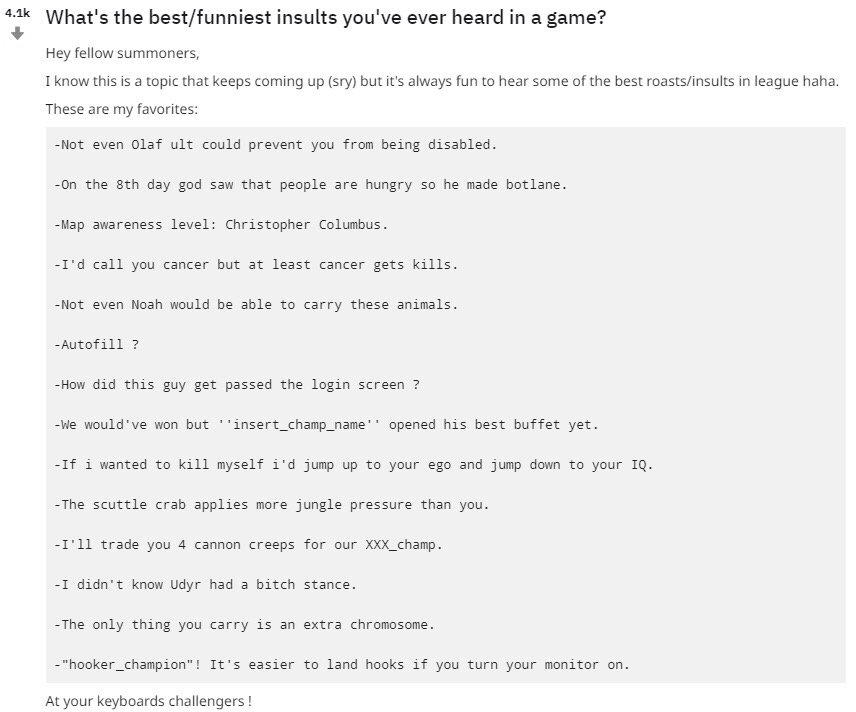 Reddit网友drayne03在论坛中发表了一个帖子分享了他目前认为他在游戏中遇见过的最有意思的嘲讽语录(不过我们还是要注意文明哦🧐
