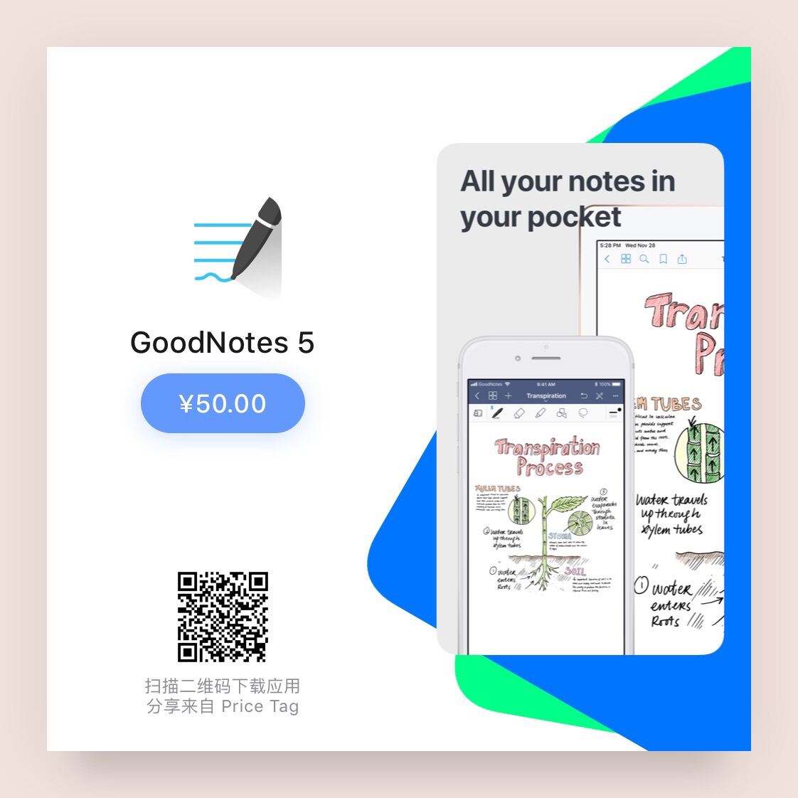 iPad Pro 的黄金搭档 GoodNotes 5 发布,新版是独立的 app,售价 ¥50,官方表示晚些会放出老用户折扣升级 Bundle。