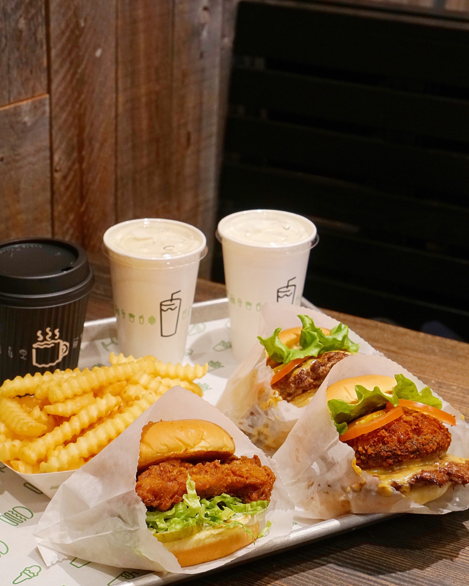 点了经典的ShackBurger、Shack Stack、新出的Chicken Shack、还有薯条、香草奶昔、焦糖奶昔、