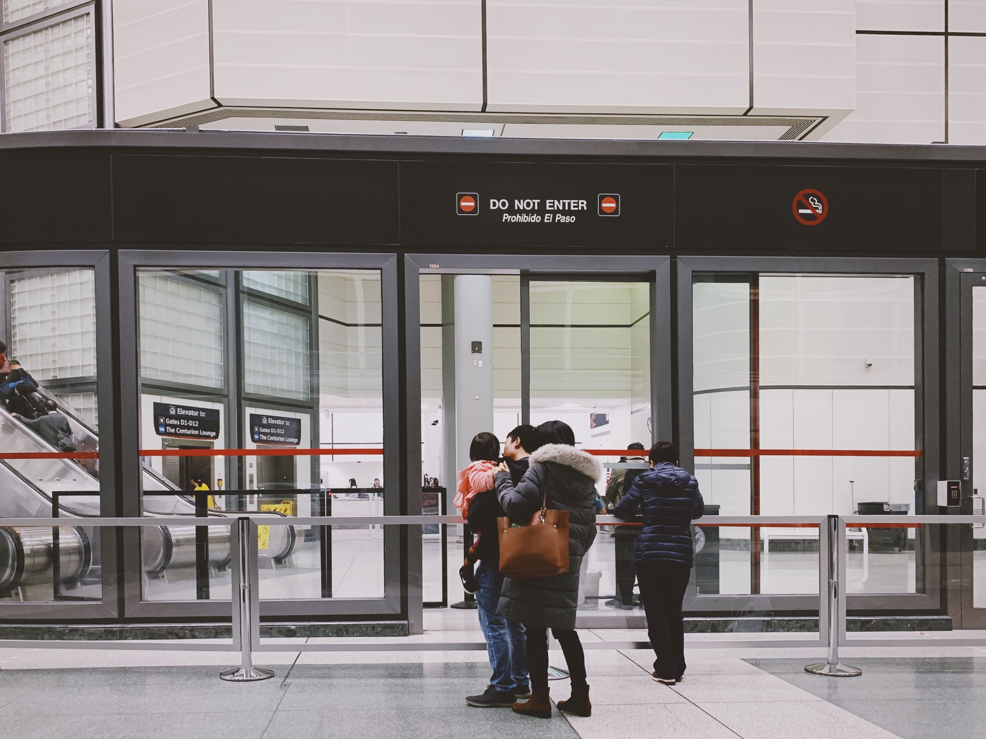 这个安检口很特别,要从后方转进去,安检完出来再坐前面的扶梯去二楼。送机者可以在大厅里看到安检之后直到扶梯上去的全景。有一道玻璃门,有专员坐在门口,负责好几件事情。