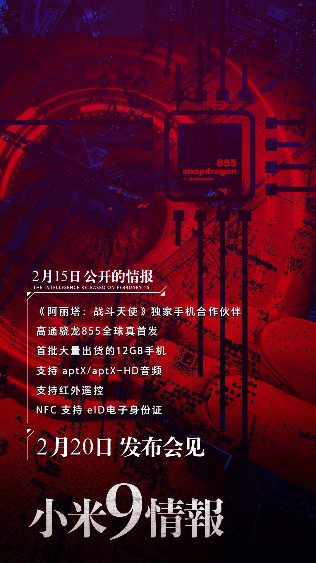 这些是目前小米 9 已知的信息,骁龙 855 全球真首发。首批大量出货的 12GB 内存手机、支持 aptX/aptX-HD 音频、支持红外遥控、NFC 支持 eID 电子身份证、和电影《阿丽塔:战斗天使》的独家合作。你们还希望小米 9 上哪些配置呢?我希望能加线性马达和无线充电,如果有防水就更好了!