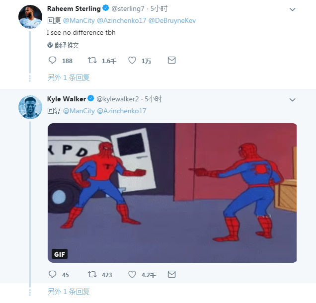 曼城官推发了一张津琴科替换德布劳内的推特,赛后斯特林留言吐槽:我看不出这俩人有任何区别。网瘾少年沃克也跟着回复了一张蜘蛛侠的表情包表示赞同。