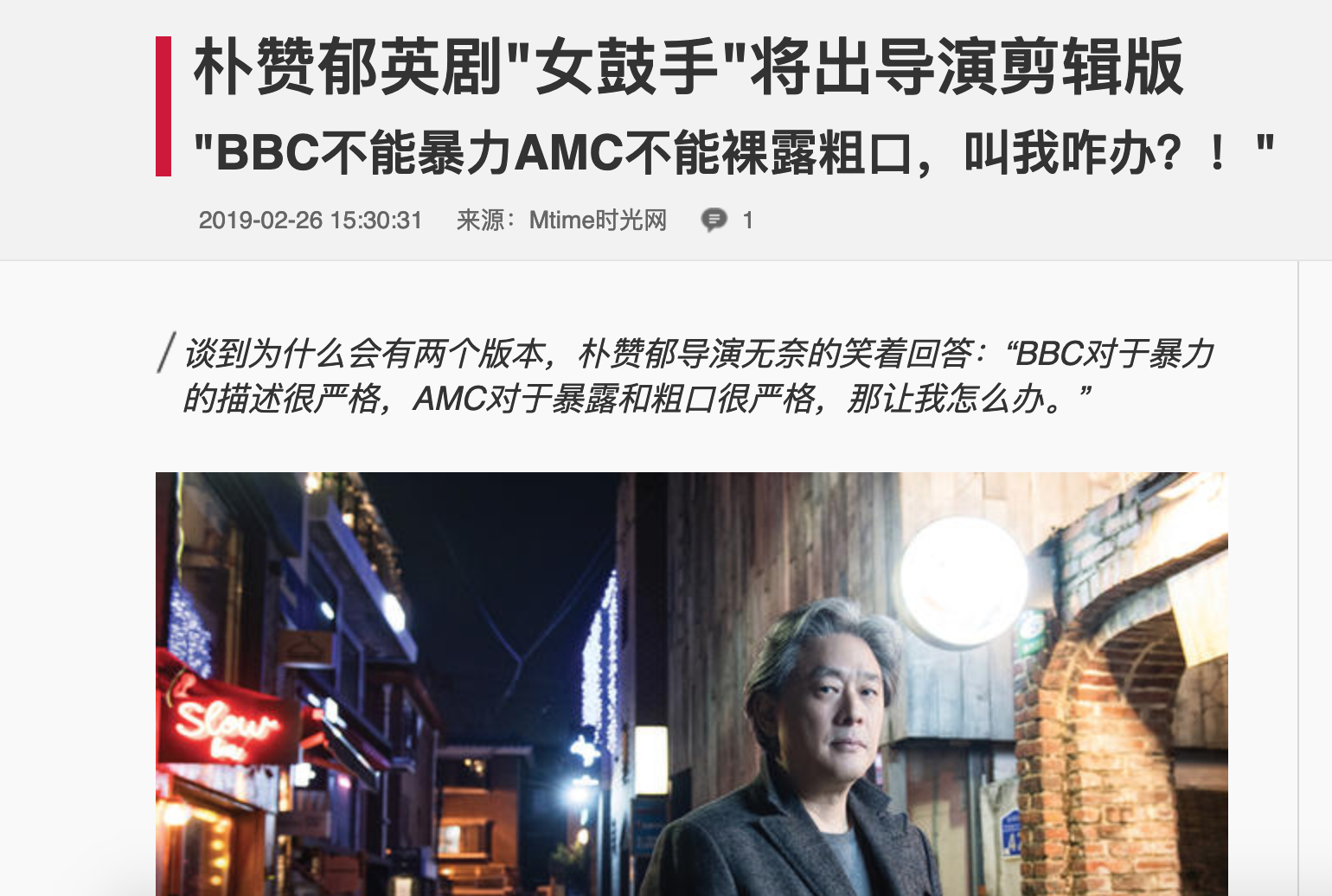 【朴赞郁英剧《女鼓手》将出导演剪辑版】 《女鼓手》将于今年3月在韩国流媒体 watcha play 上线,这一版本与此前在英国BBC和美国AMC播出的版本将会有很大不同,朴赞郁日前在接受韩国电影杂志《CINE21》专访时表示,“时间太紧”和“审查”是推出导演剪辑版的原因🌝