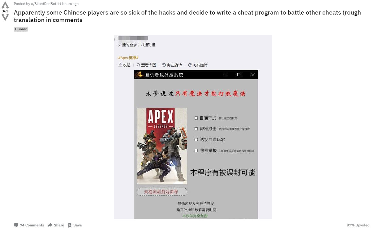 【以挂制挂,《Apex英雄》玩家开发反外挂外挂?】Reddit 上一国外网友 SilentRedBoi 发现了一款由国人玩家制作的《Apex英雄》“复仇者反外挂系统”,简而言之就是个反外挂的外挂,内置有“自瞄干扰”、“降维打击”(周围的闪电侠恢复正常速度)、“透视自瞄玩家”、“快捷举报”等功能。不过目前该外挂的可用性貌似还并没有得到证实。也有玩家在评论区开玩笑称“官方都拿外挂没办法,没想到却被其他外挂制作者反制了”🤦♂️