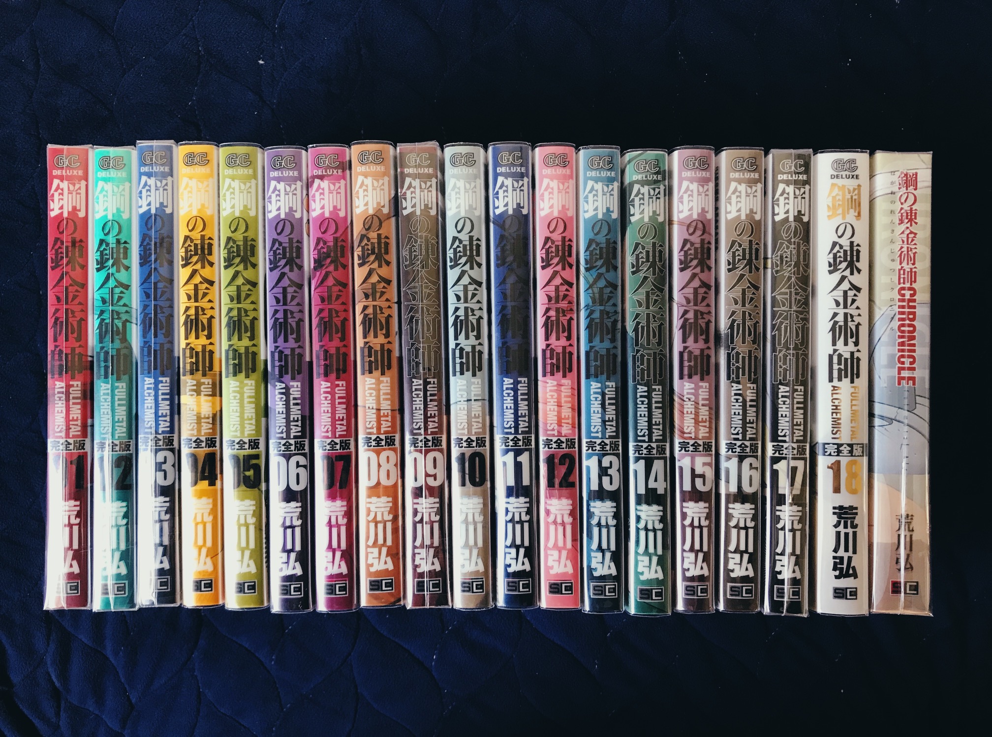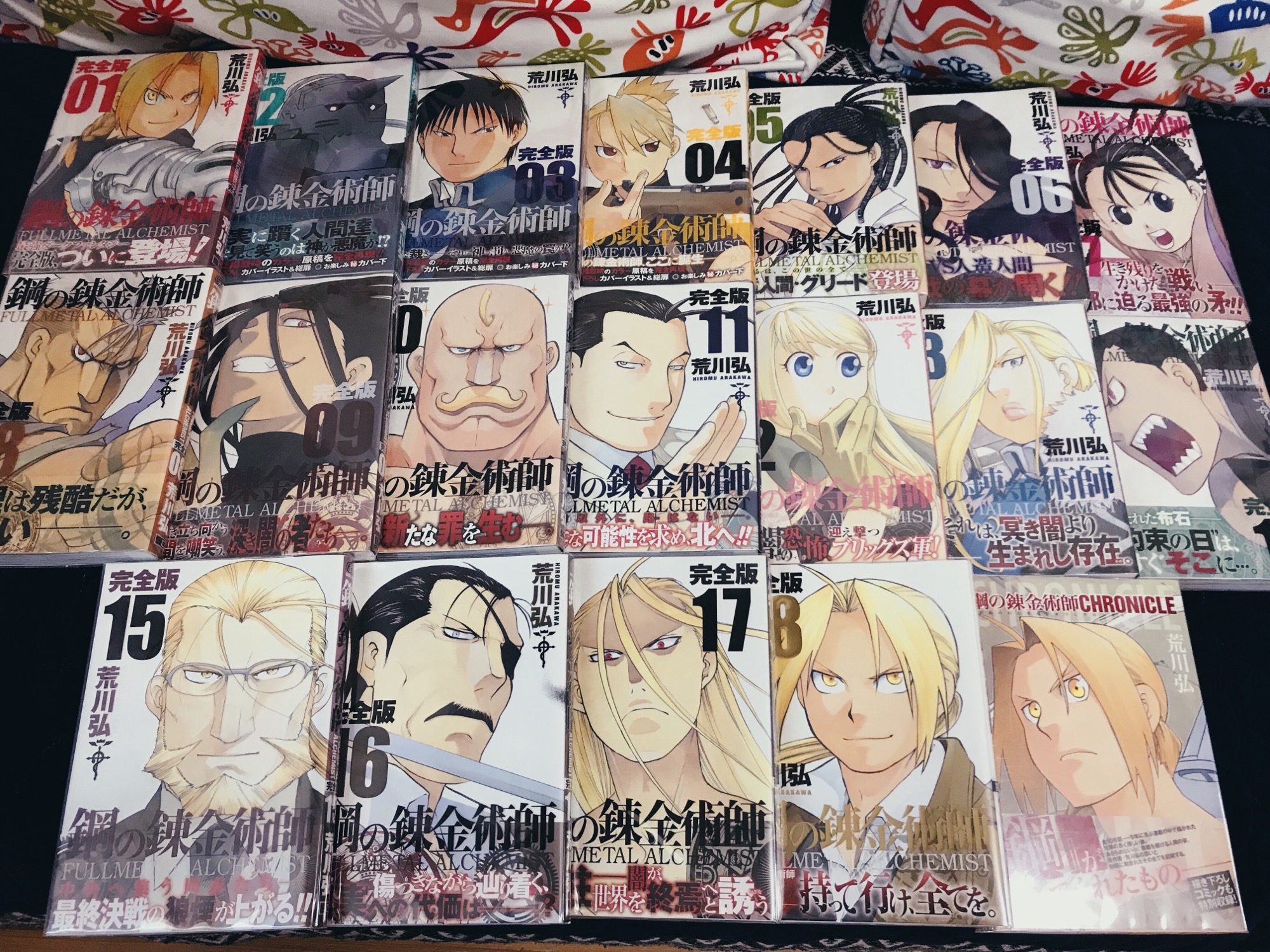 #钢之炼金术师#日版完全版,1-18+公式书全,全初版全书腰。目前我收藏中最喜欢完成度最高的一套完全版漫画,牛姨重绘了封面,还增加了很多跨页彩页,除了扉页硫酸纸,烫金这种基本配备,每本书还有专用的硬pvc书壳,连书的内封都是绘图草稿(包了书皮所以不拆开拍照了),甚至书腰的字体搭配都无比协调完整(也因此全书腰好品相的已成为中古稀有),是我见过完全版漫画里待遇最高之一的了...