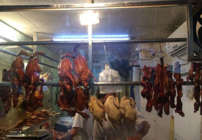 小小店面,透过玻璃档口里面满满的鸡鸭鹅,豉油鸡,白切鸡,烧鸭,烧鹅,蜜汁叉烧,爪,翅,肾,颈,翼。