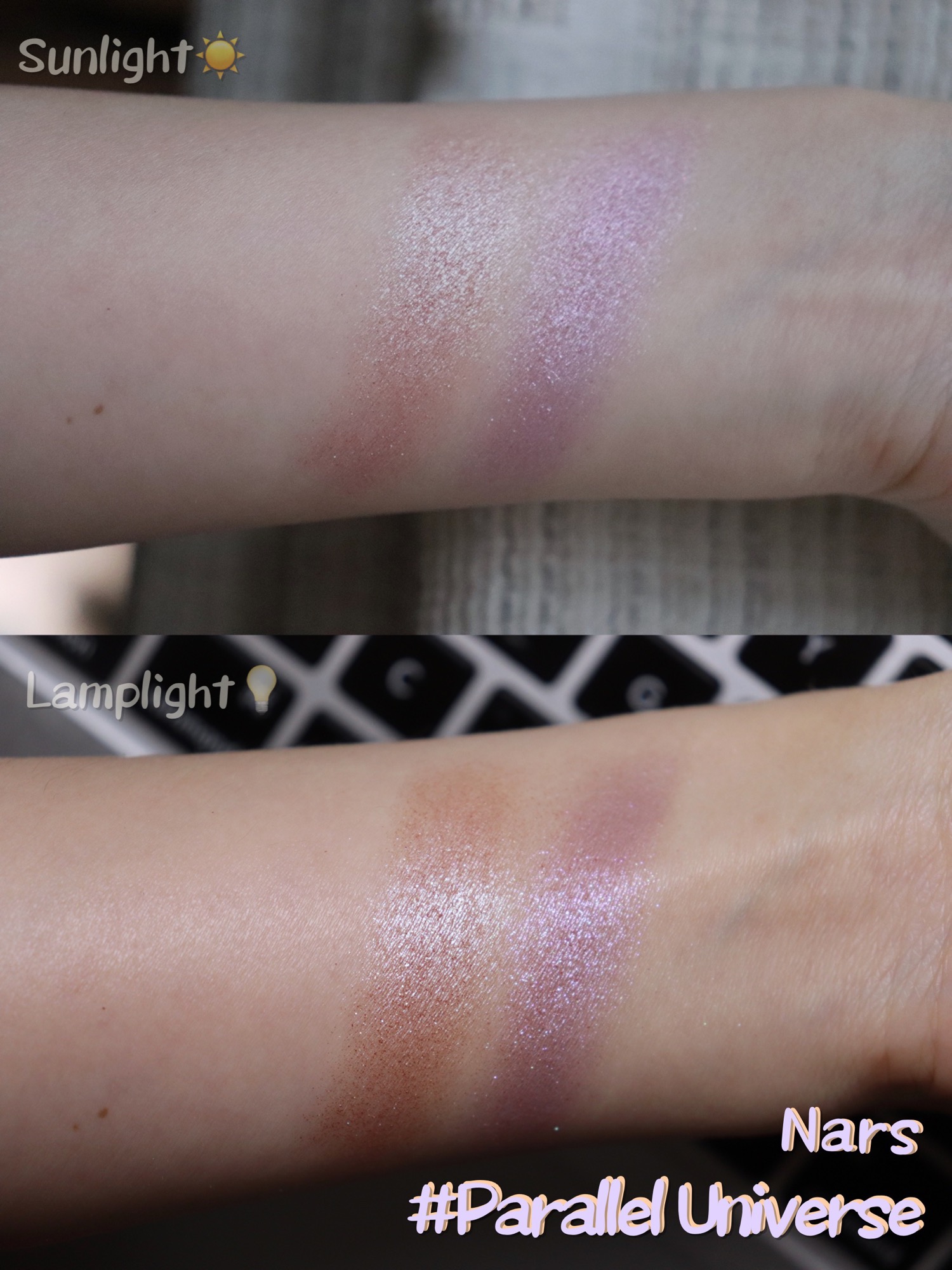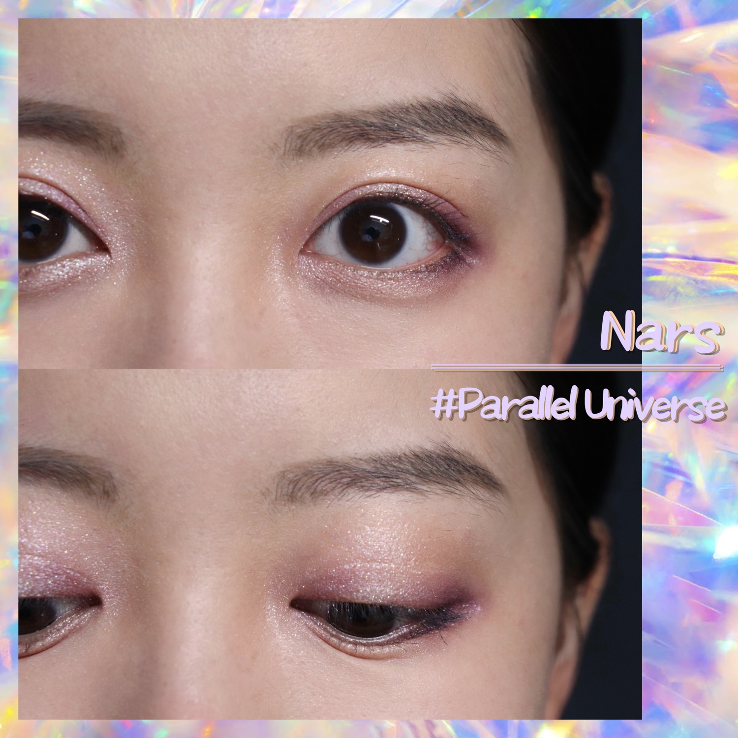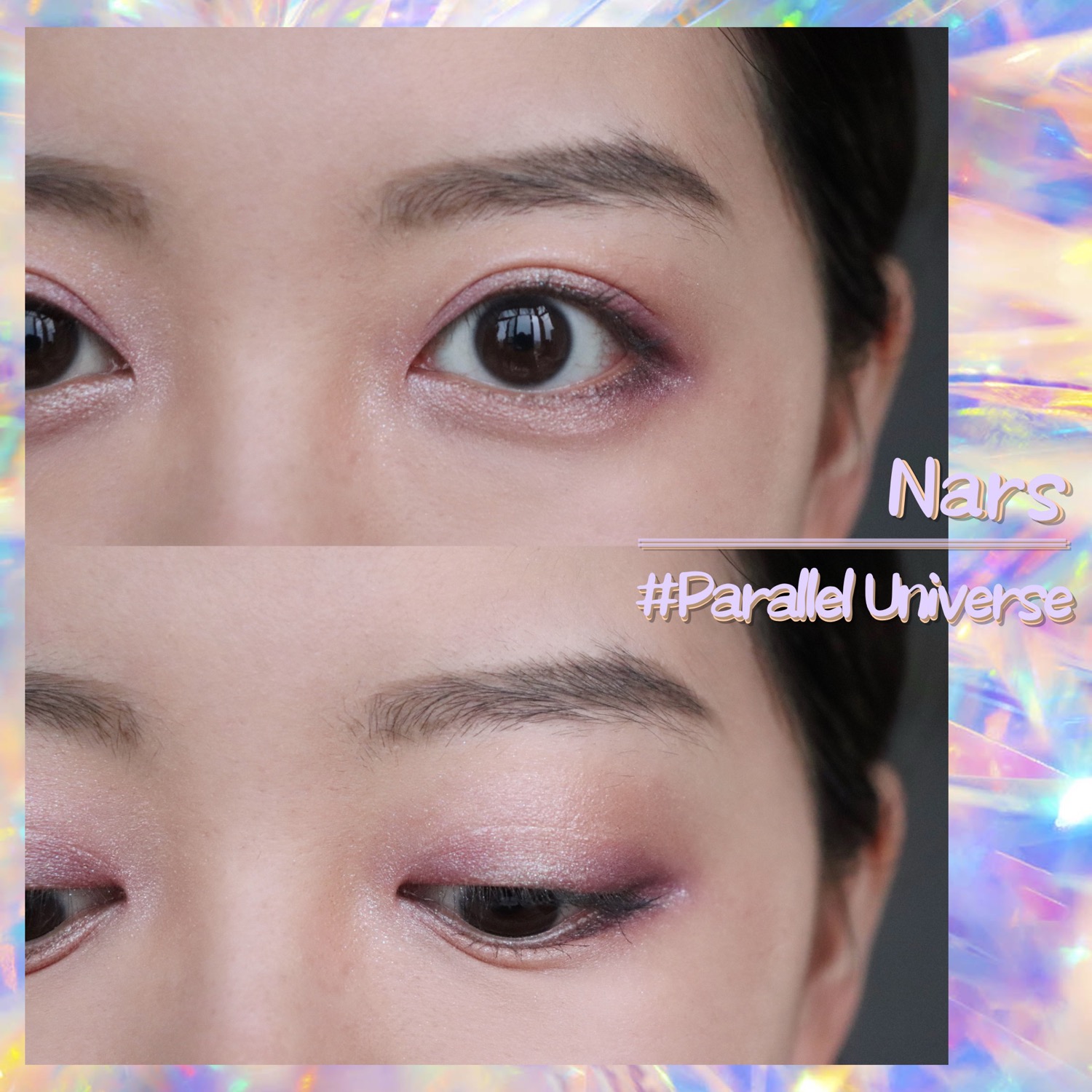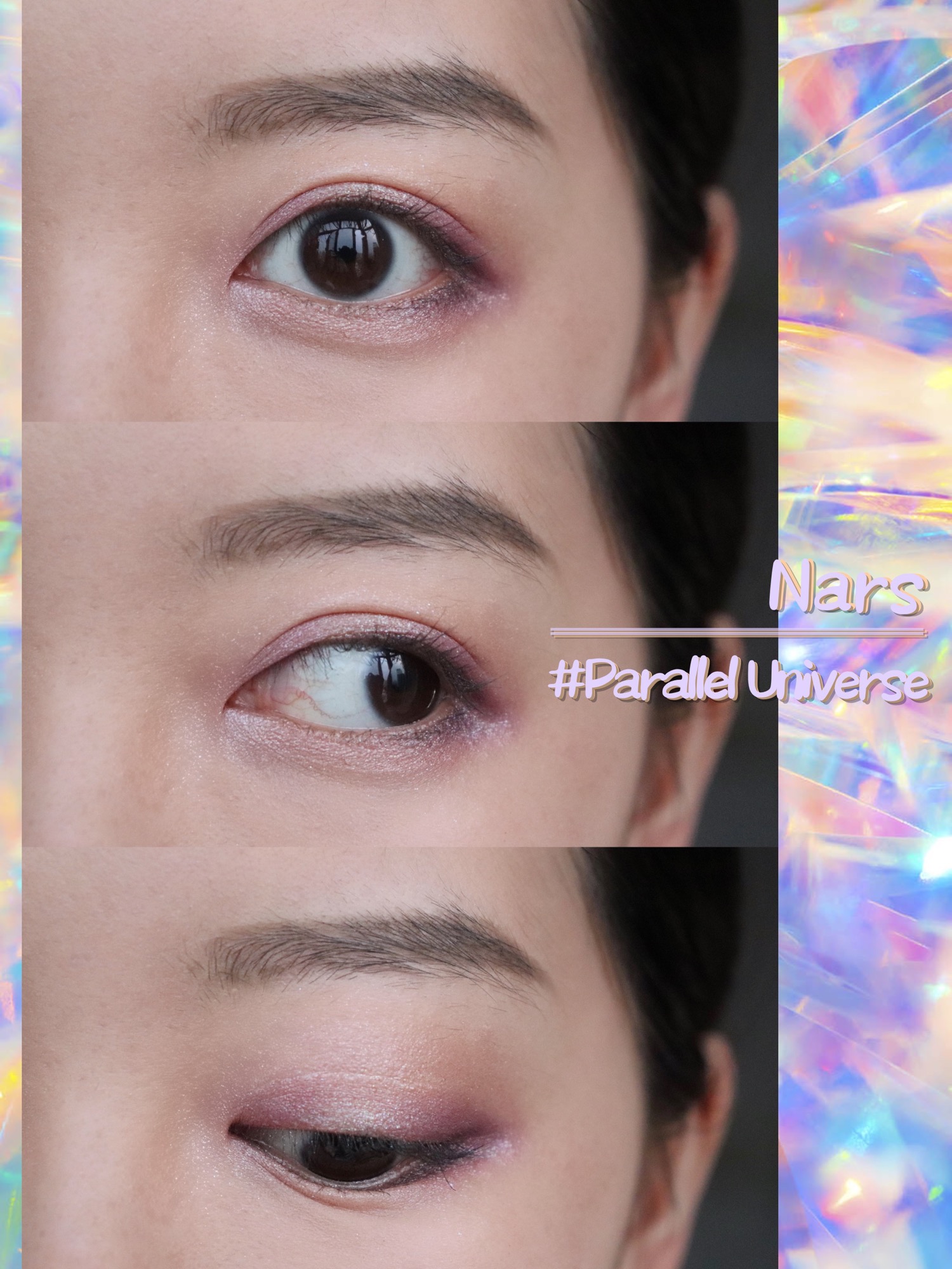右侧“带有五彩闪的冷银色偏光的薰衣草色”适合粉色调或紫色调妆容,可以作为眼部的打底色增加光泽感,但是使用时要注意眼头和眼尾一定要用饱和度更高明度更低的颜色压住,否则在视觉上会有强烈的浮肿感,也会显脏。怎么说呢,这就属于手臂上看着极美,但极其不使用的那种颜色吧。