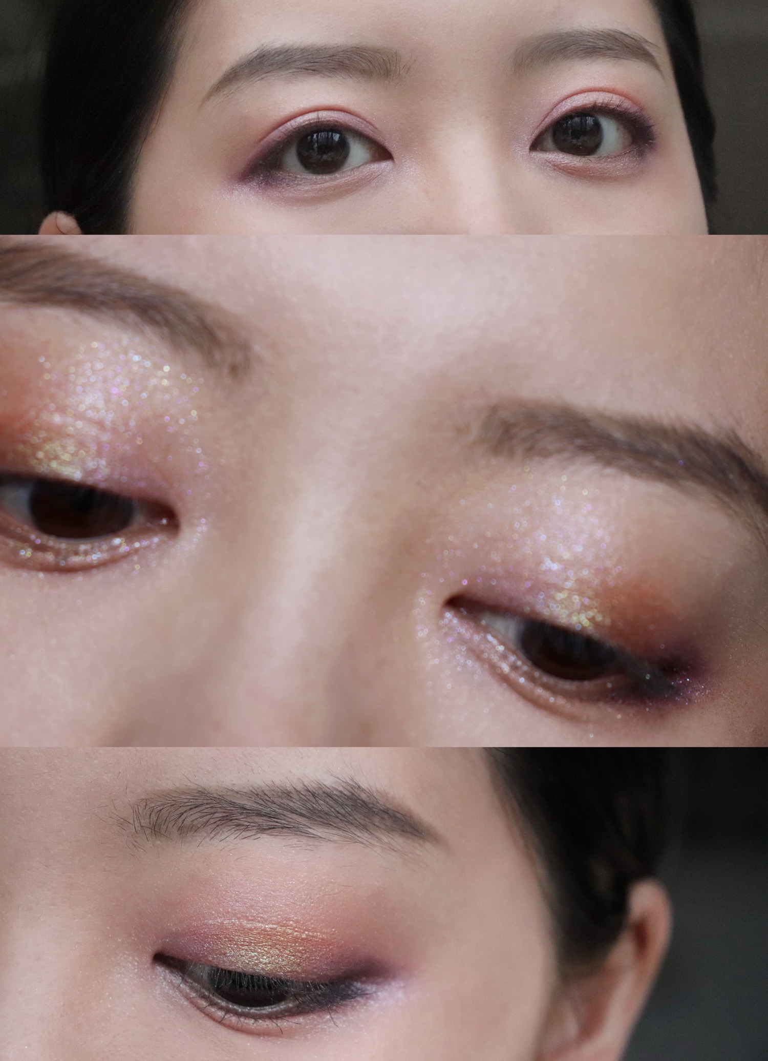 左侧“带有五彩闪的重度偏光米橘色”适合叠加在暖色调大地色的眼影上,底色的米橘色其实和香槟色类似,但是又多了一抹流畅的偏光。闪片也不是通常的银闪而是璀璨的五彩色。这样层次丰富的颜色,叠加在偏暖的大地色上,既不会喧宾夺主,又能够增加眼妆的独特性,减轻大地色的沉闷感。