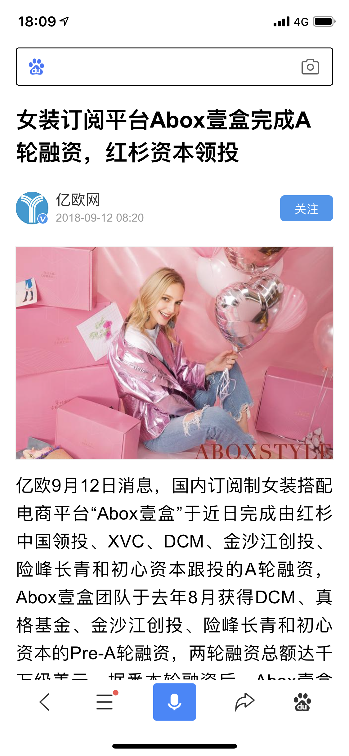 “2018年9月12日,国内订阅制女装搭配电商平台“Abox壹盒”于近日完成由红杉中国领投、XVC、DCM、金沙江创投、险峰长青和初心资本跟投的A轮融资,Abox壹盒团队于去年8月获得DCM、真格基金、金沙江创投、险峰长青和初心资本的Pre-A轮融资,两轮融资总额达千万级美元。据悉本轮融资后,Abox壹盒团队将重点投入在产品优化和技术团队的搭建。