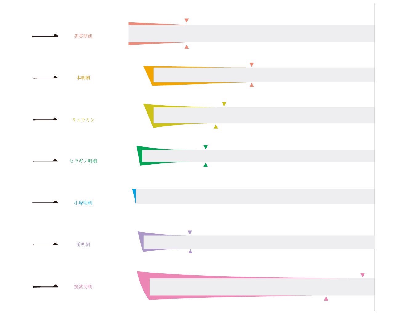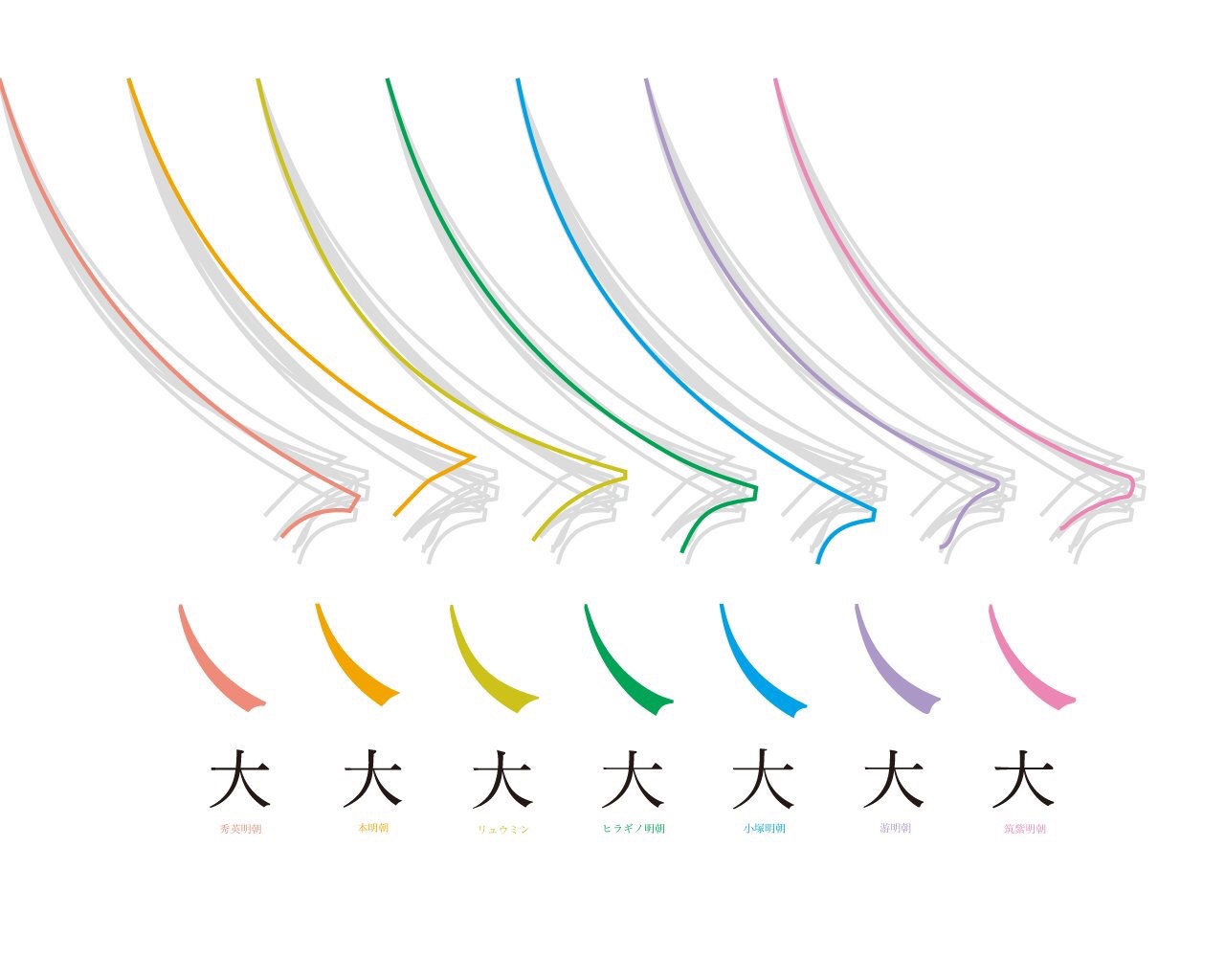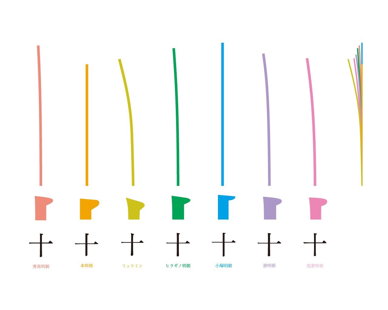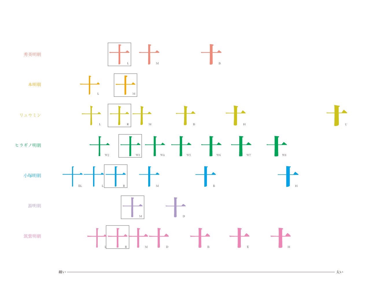 七种明朝体(秀英明朝、本明朝、リュウミン、ヒラギノ明朝、小塚明朝、游明朝、筑紫明朝の7つ)的特征总结,很有意思(来源:ぎリさ)