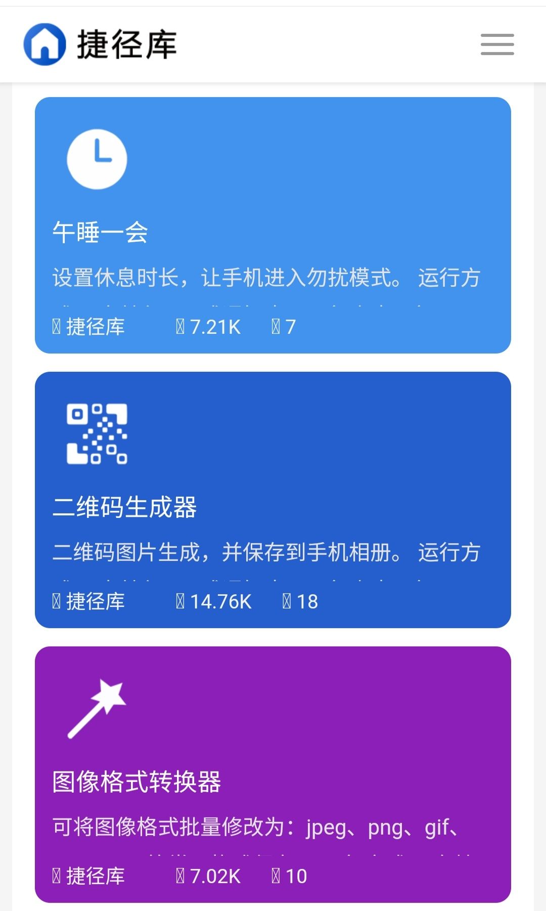 捷径库为苹果用户提供非常丰富好用的中文捷径。包含工具,图片,影音,娱乐,阅读等分类,有近百种实用捷径。