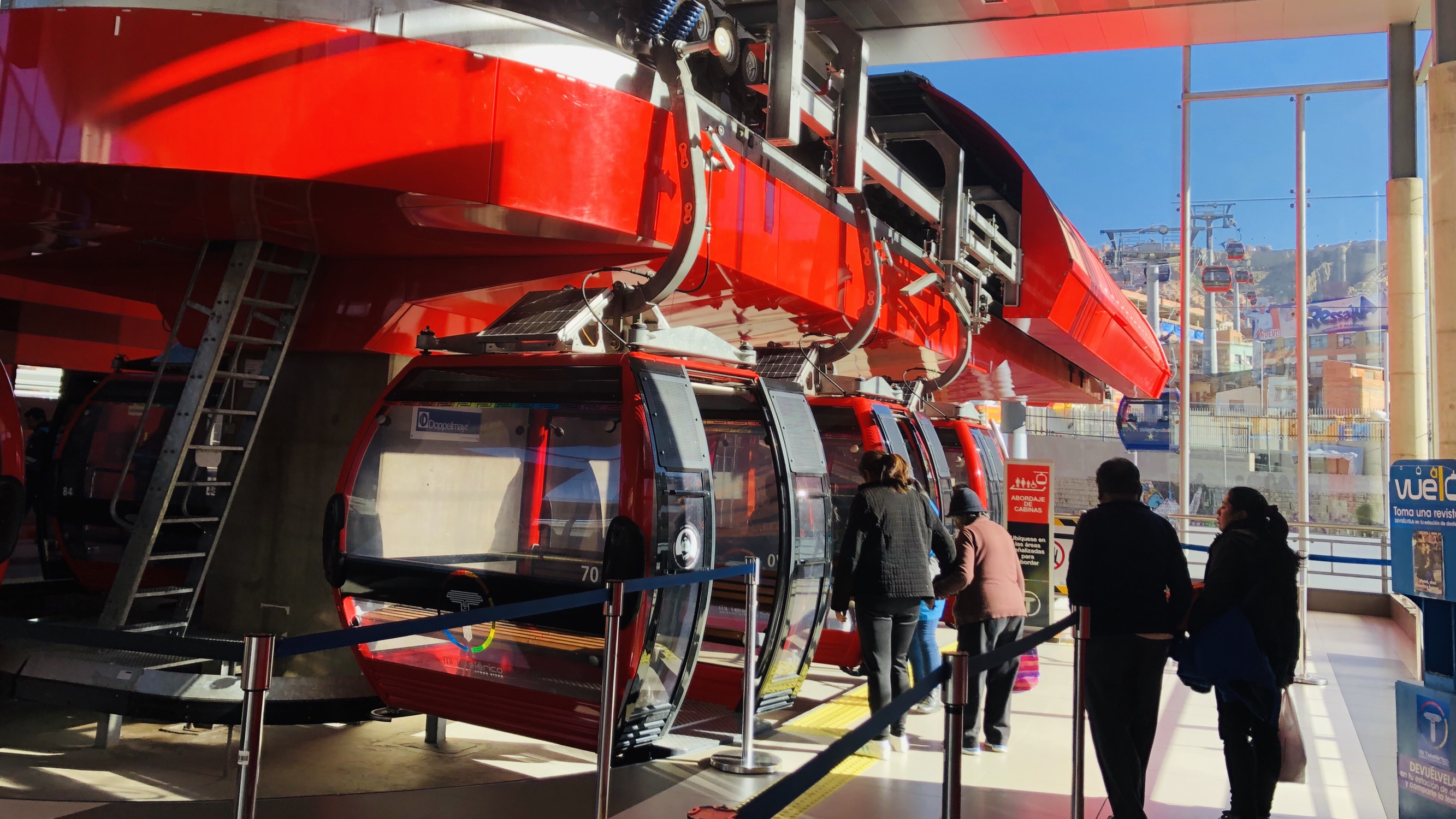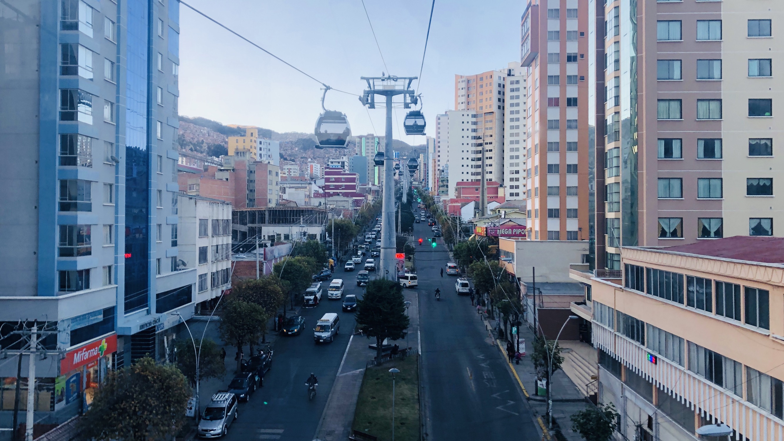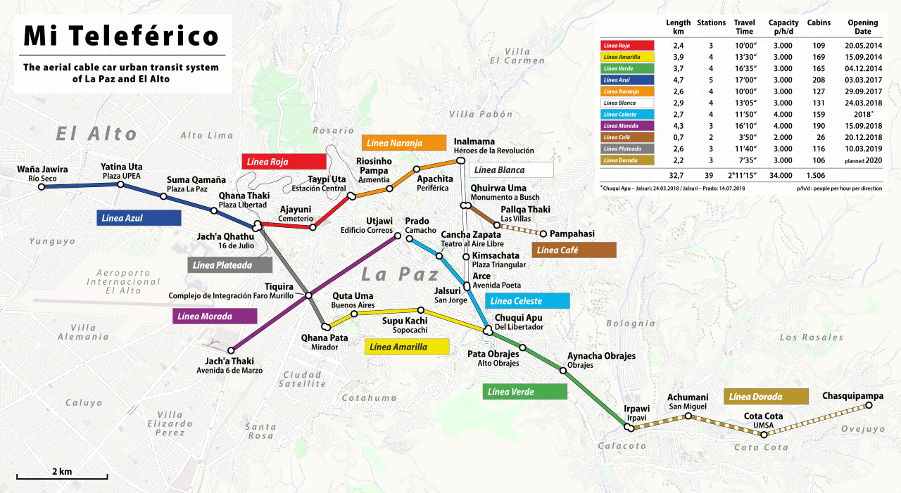lapaz mi teleferico:玻利维亚首都lapaz拥有全世界唯一的缆车公共交通系统。为了解决位于河谷的lapaz和四百米高的高山郊区el alto的运输痛点 政府于2012年开始投资修建mi teleferico缆车系统。2014年竣工第一阶段 整整10公里长的缆车轨道让其登上世界最长缆车系统的位置。整个项目计划了整整30公里长的缆车轨道系统 包括了10条路线 35个站点。