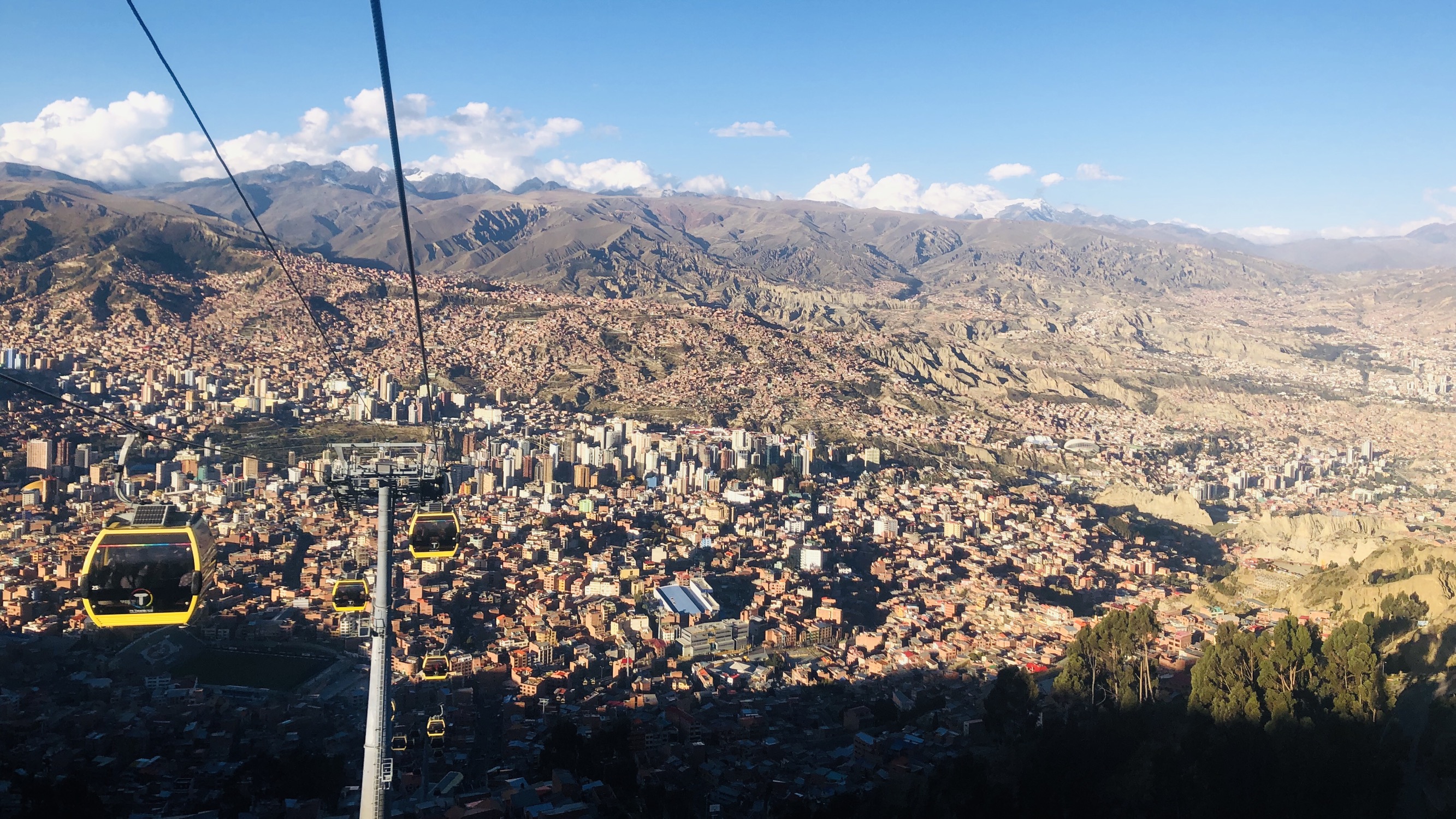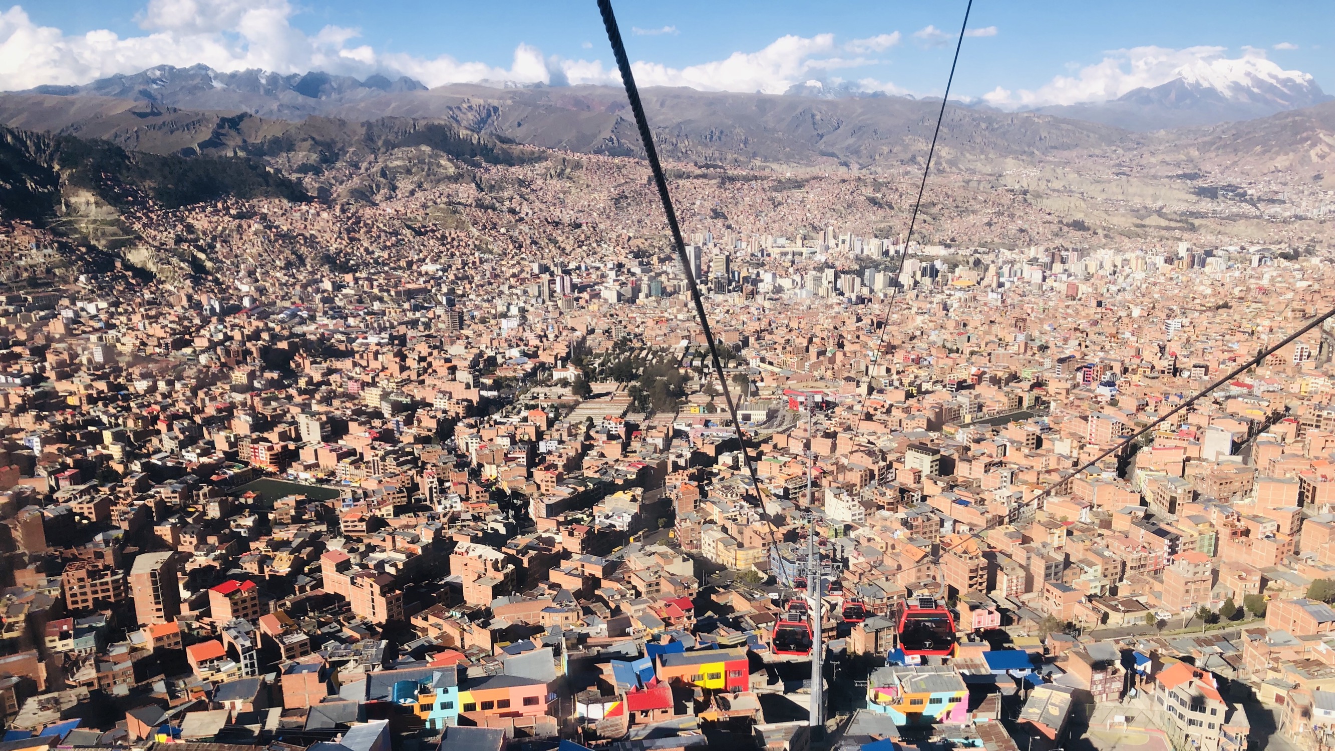 我们从taypi uta坐上了一路攀登四百米高的红线达到了jacha qhathu山顶;又坐着灰线顺着el alto山谷一路向南 沿途的view实在不能再好;接着搭黄线下山 一路甚至还有点紧张;出站后搭蓝线换乘白线 在城市中心的大道上一路缓缓上坡来到了inalmama 有点不舍的下了缆车 最后搭出租到了mirador kilikili观赏日落雪山金顶。