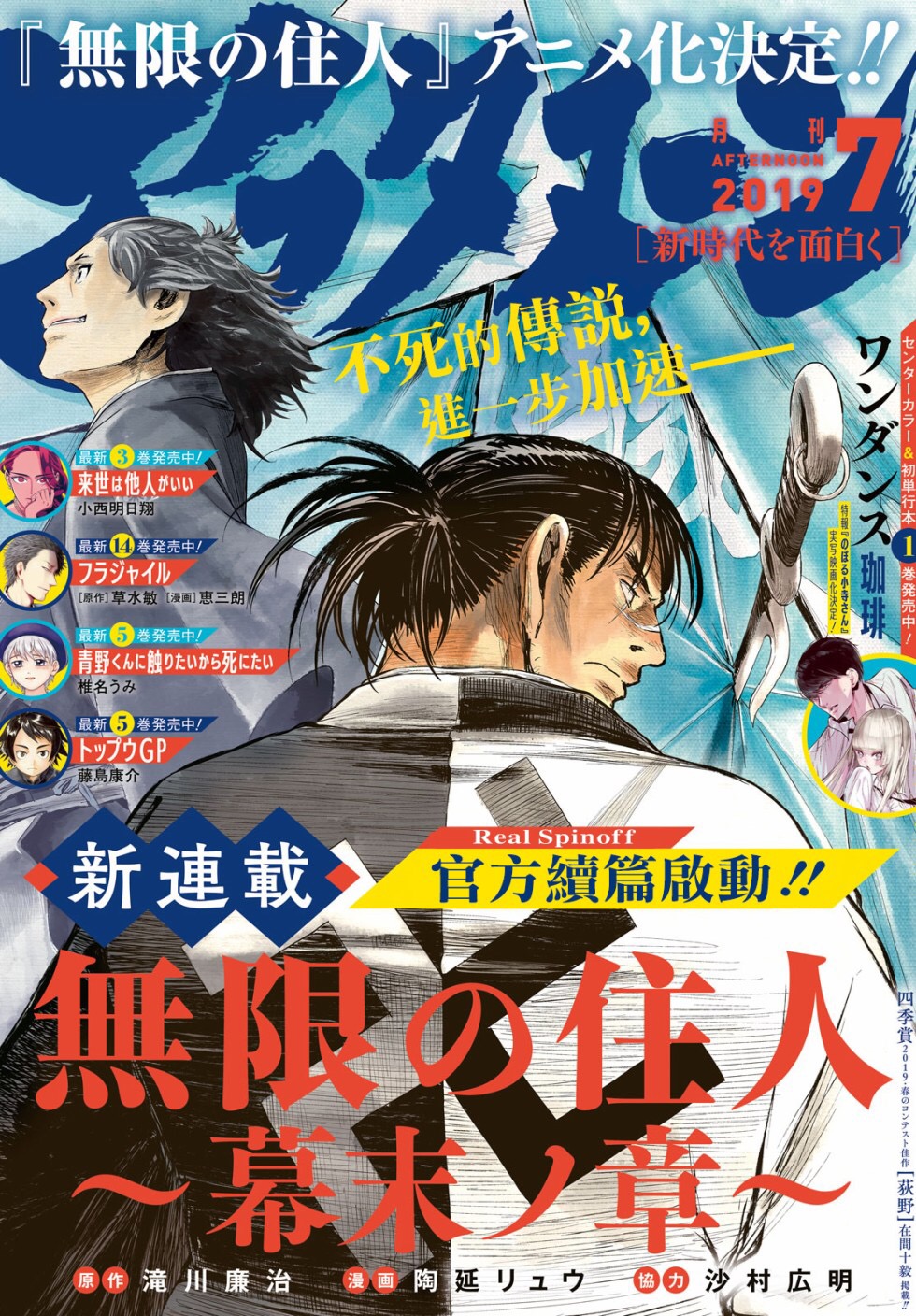 随着动画化决定,在昨天5月25日发售的讲谈社月刊AFTERNOON 19年7月号上续作漫画《无限之住人~幕末之章~》开始连载了