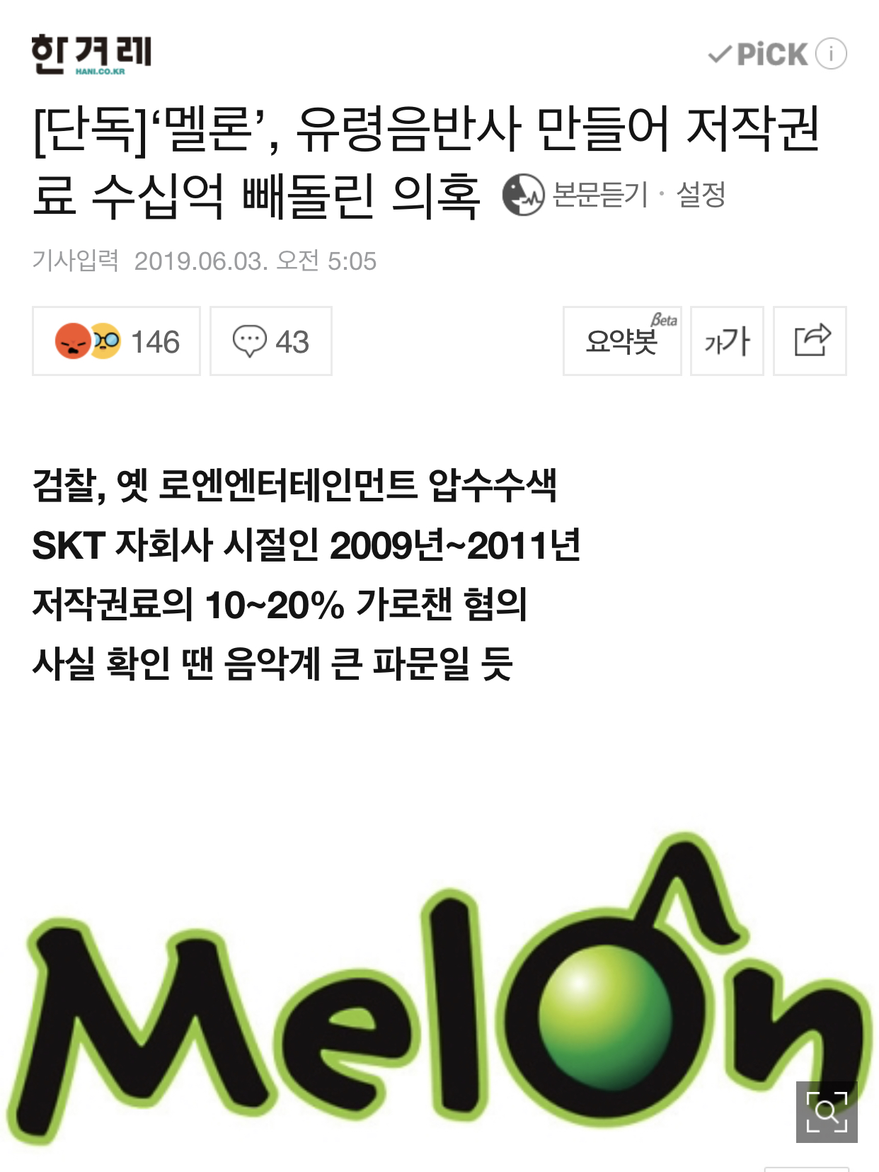 2日《韩民族》的采访结果显示,首尔东部地方检察厅网络调查部(部长金泰恩)上个月27日搜查了首尔江南区三成洞前loen娱乐办公室(现kakao m办公室)。检方相关人士表示:"以涉嫌挪用数十亿韩元著作权费为由,对melon的旧办公室进行了搜查。" 2004年以SK电讯(SKT)公司内部服务开始的Melon,从2009年1月开始由SK电信子公司Loen(前首尔唱片)运营,2016年被Kakao收购。