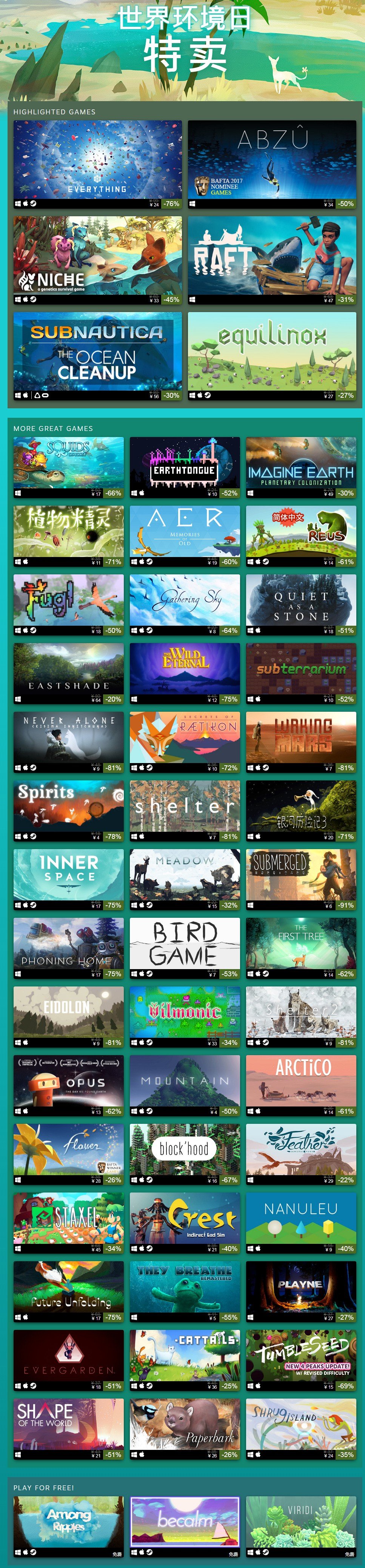 【Steam开启世界环境日特卖 《ABZU》等文艺游戏打折】Steam开启了世界环境日特惠,海底冒险游戏《ABZU》34元(史低20元),《山》制作者的新作《万物》24元(史低12元),多人海上生存《木筏生存》47元史低,动物生存策略游戏《Niche》33元(史低20元),开放世界生存游戏《深海迷航》56元(史低34元)