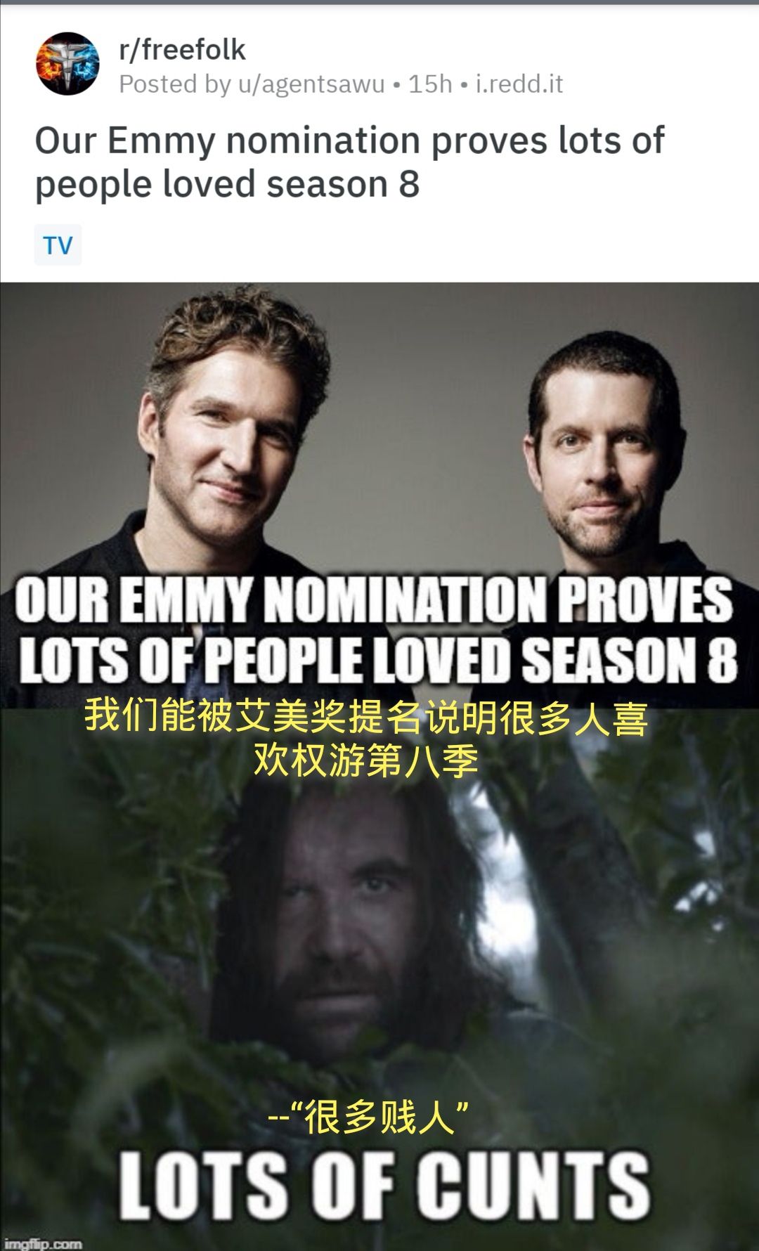 外国网友对于近期权游的编剧不出席漫画展和被提名艾美奖两件事的吐槽:👇