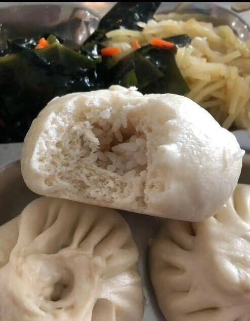 饿了,吃个米饭馅儿的包子!
