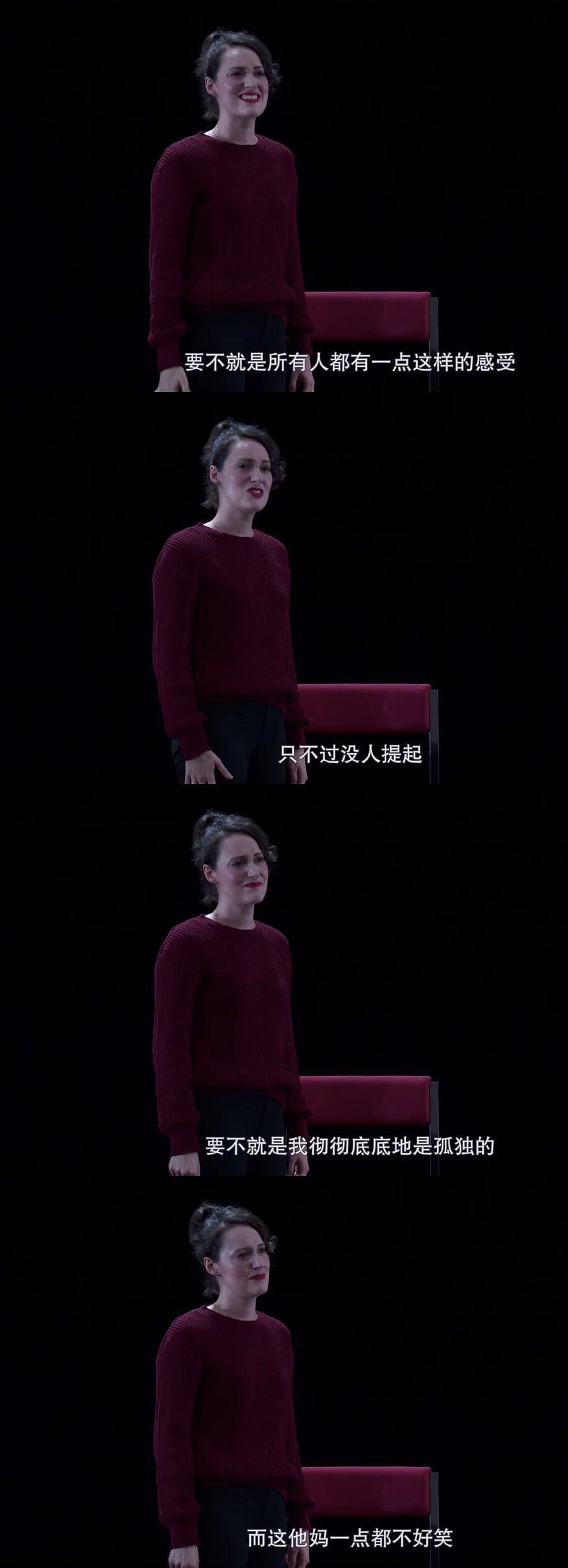这里的菲比才是真有魅力,有静有动的演技,黑色幽默/自嘲/悲伤都很到位,英式喜剧太有趣了,太生动了,虽然很悲伤的故事,但全场都太爆笑了,笑料太足了,独角戏很棒。