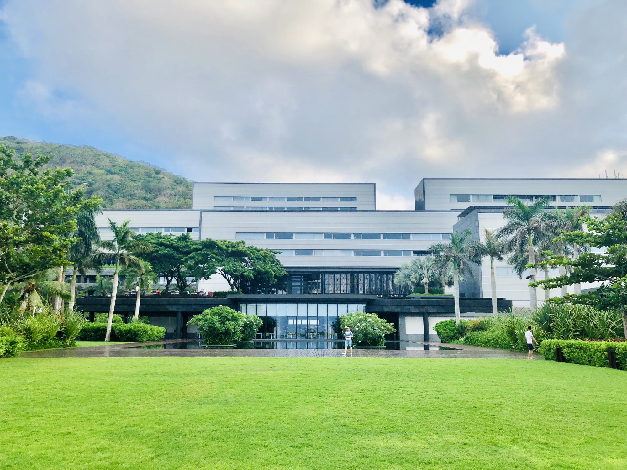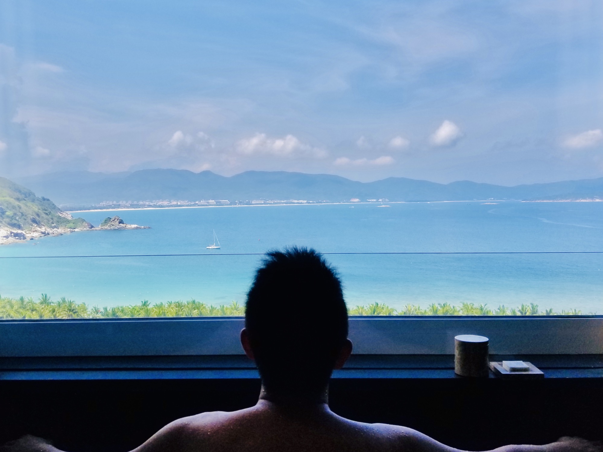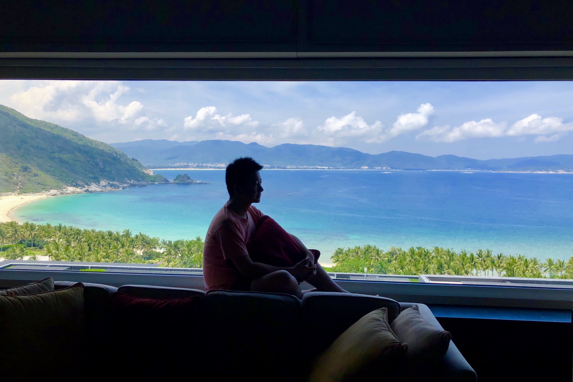 Checkin时前台小姐姐给了一份酒店地图,讲解了各个功能区和房间的位置。Checkin后礼宾带领着穿过几个门廊再乘坐电梯上到了房间。入住的是至尊海景房。全景窗外整个太阳湾无敌的海景尽收眼前。在没有阳台的全海景房间里,眼前的这一切就像一幅画,山、海、天,安安静静的就在那。
