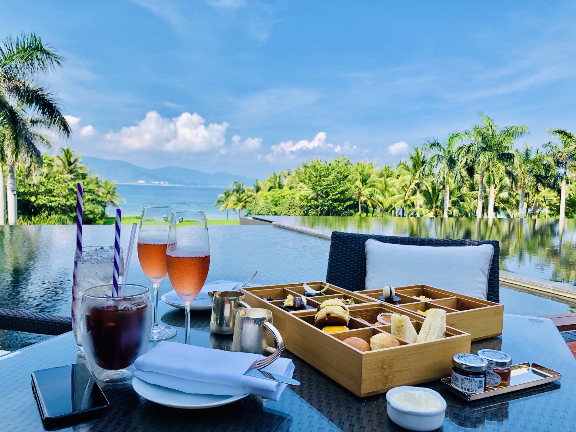 酒店的下午茶安排在二楼观景湖旁的观景台。在这里临湖而坐,海风习习,享用下午茶的同时海景也尽收眼底。只是如果想要拍出绝佳的照片,一定要早点去挑一个室外临湖的座位。