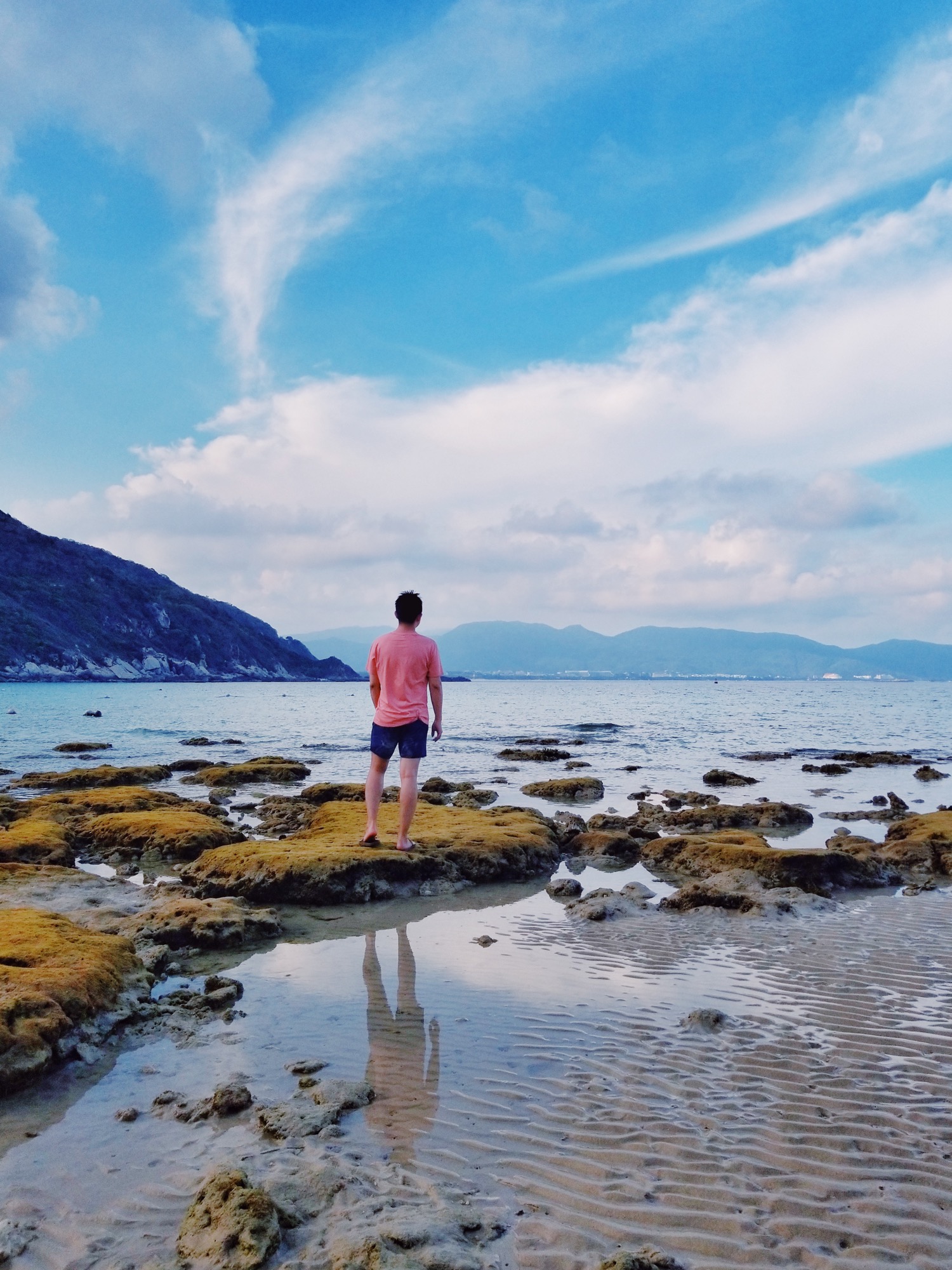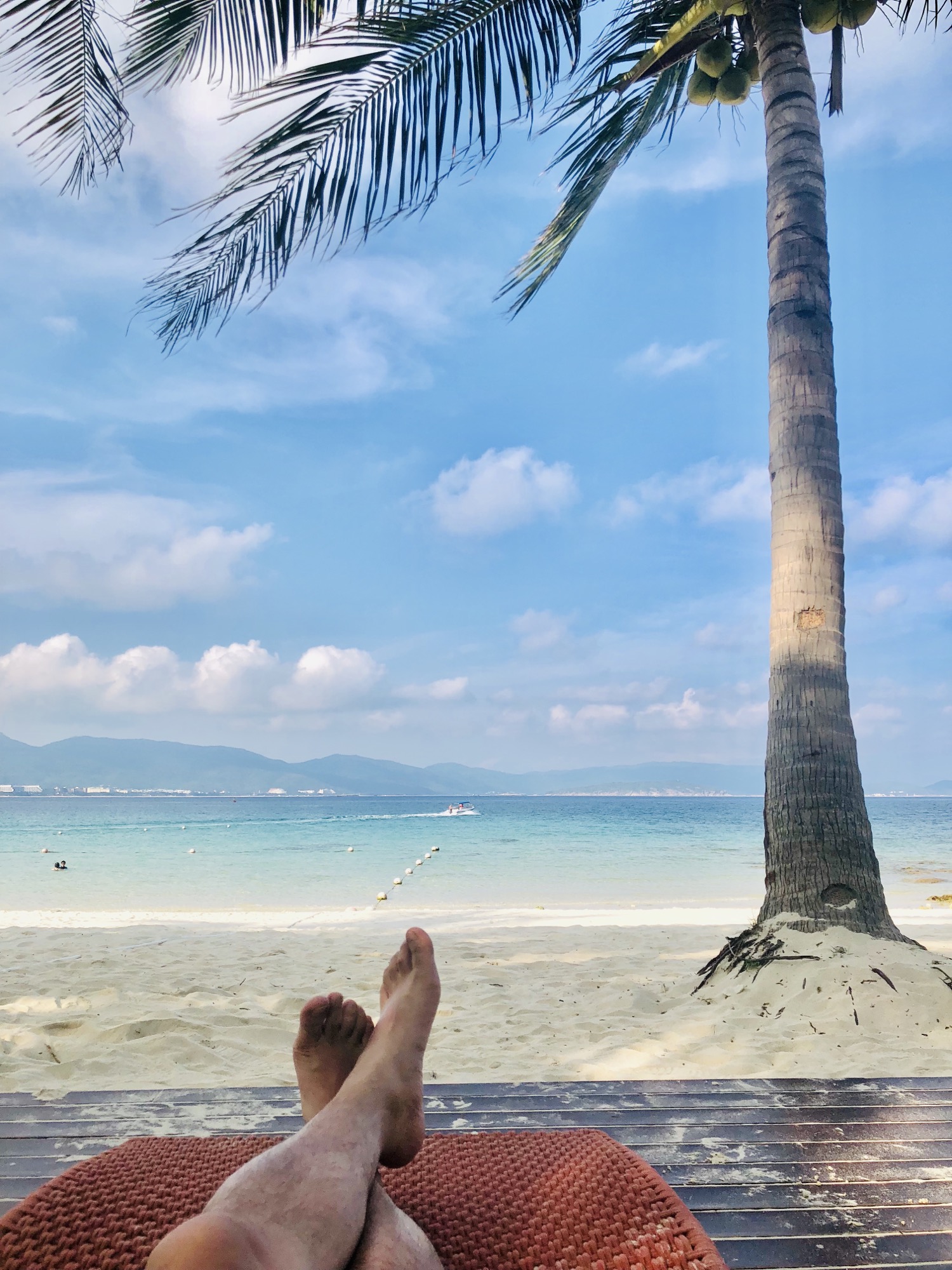 由于是独享一湾,虽说沙质比起亚龙湾不一定会好多少,但至少这私人海滩,温柔而静谧,相比于外面的人山人海,这里的与世隔绝,已经胜过一切。远处的浅滩,退潮之后礁石裸露在外,捡贝壳,赶赶海,也是亚龙湾和海棠湾没有的体验。