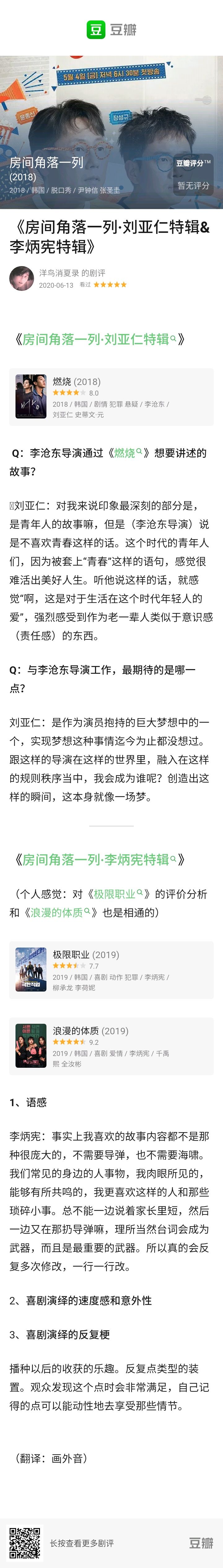 原本听说最新一期的嘉宾是刘亚仁才看的,结果发现节目本身更了不得,随后又刷了李炳宪特辑和是枝裕和特辑。刚好节目仅有的长评就是豆友“洋友消夏录”整理的这三期的文字版。
