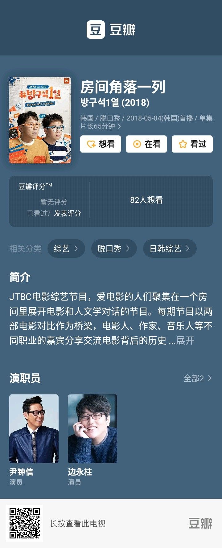 《房间角落一列》是由韩国JTBC电视台出品的一档以介绍韩国电影为主的谈话类节目。每期通常会以播放片段的形式分享两部电影,同时会邀请主创到现场分享创作中的故事和自己的想法。从话题作到新浪潮,囊括了超过百部韩片。对于韩影爱好者,是不容错过的宝藏节目。