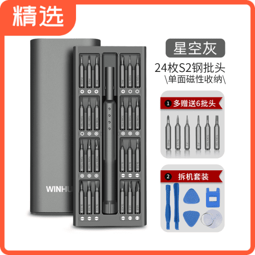 内含24种不同规格的批头(S2材质),加送6个,共30个批头。采用双重防锈处理,批头支持磁吸收纳。整体重量约300g。
